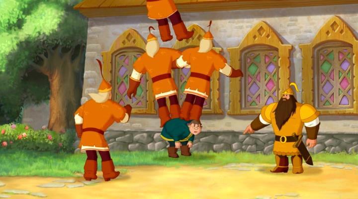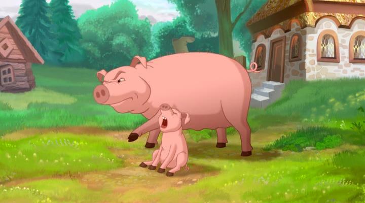 Первый мульт про Ивана и Волка начинался вроде бы и неплохо, но сразу с тупых приколов. Отец выгнал Ивана Царевича нафиг за то, что раздолбай, но Иван когда уходил, успел прогневать свинью, и та ему дала хорошего пинка, запустив Ивана в полёт.