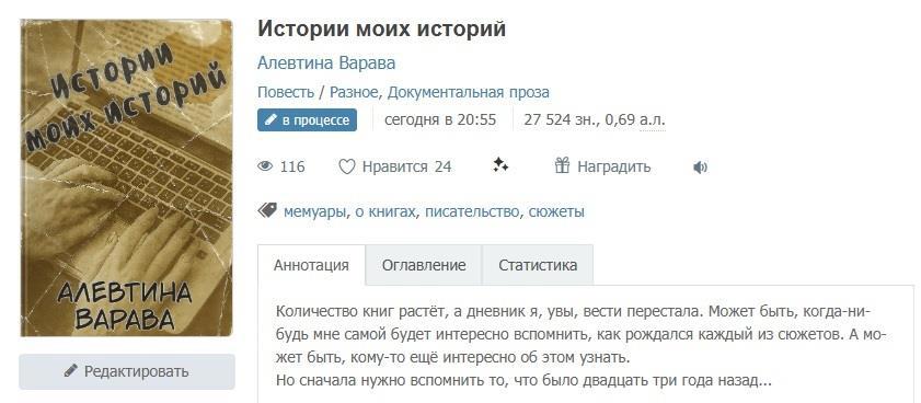 Автор: Алевтина ВараваВчера под утро вместо сна оказалось необходимо срочно написать истории создания всех моих книг) Так бывает. Я пока в процессе, но часть уже охватила. Получаются своеобразные мемуары о том, как и почему зародился тот или иной сюжет. Что навело на соответствующие мысли, как оно вообще всё придумывалось. Эдакий «Фильм про фильм», но в литературе.