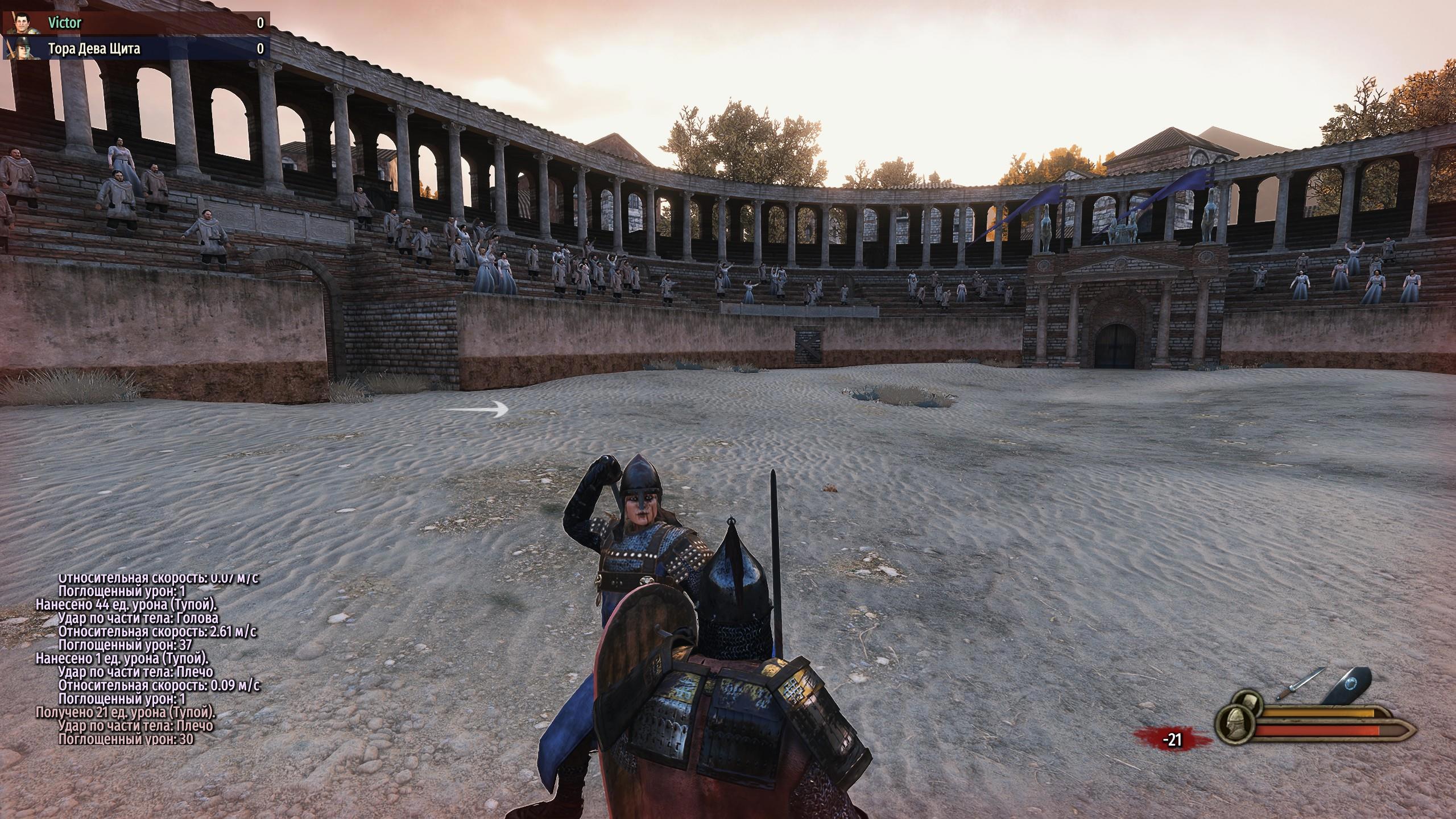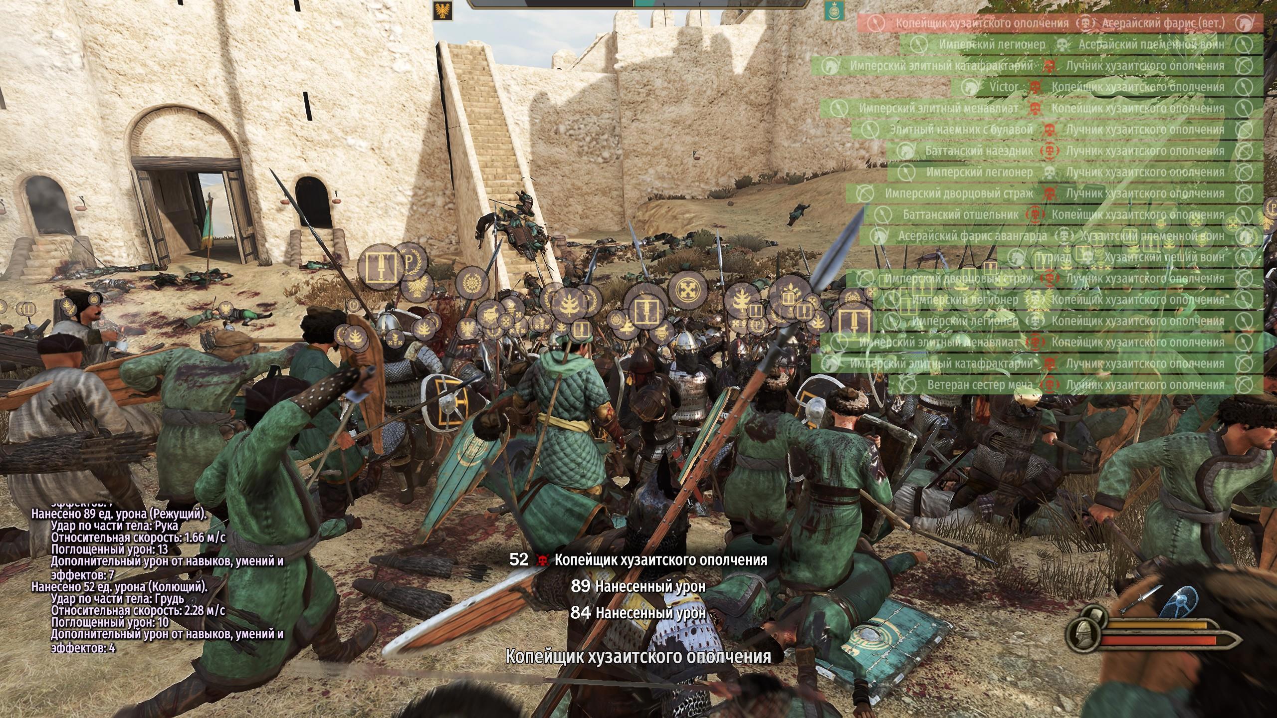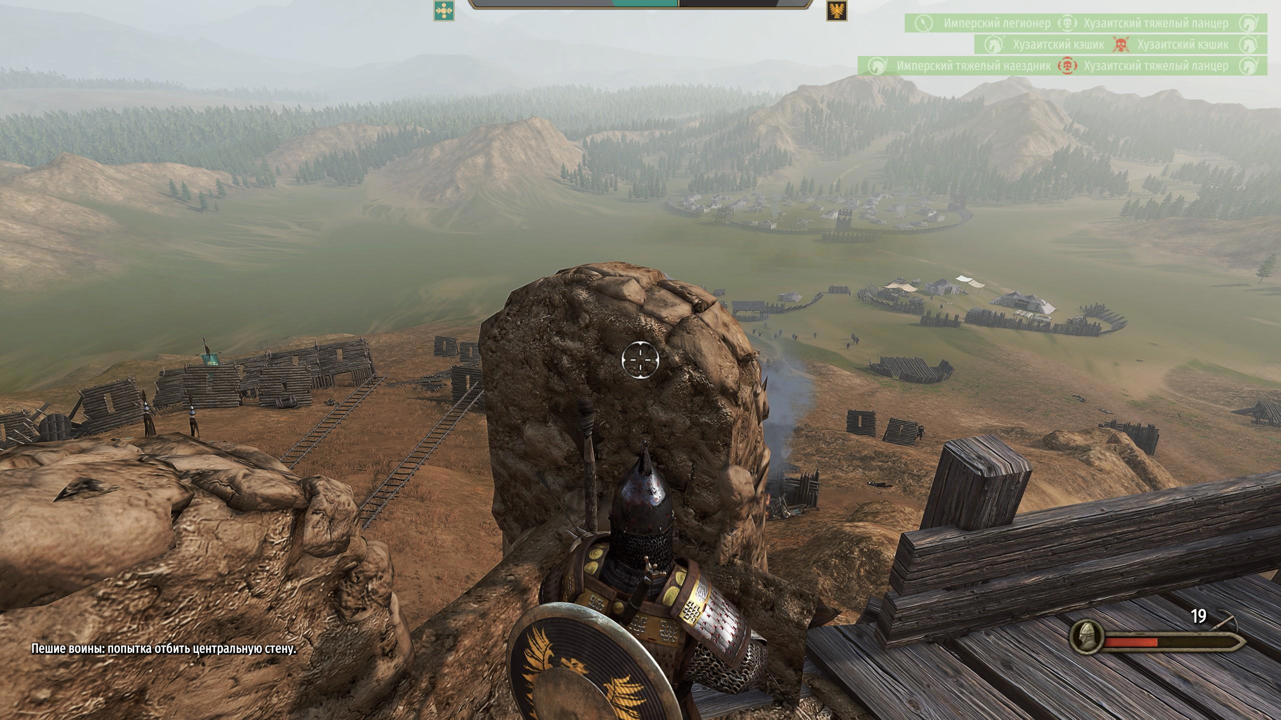 С индивидуальной всё просто – мы можем наносить обычные атаки в одну из трёх плоскостей, колоть, пинать ногой. Есть блок оружием, есть блок щитом, обычные копья могут только колоть, из луков и арбалетов можно стрелять, слегка приближая экран. Вот, собственно, и всё.
