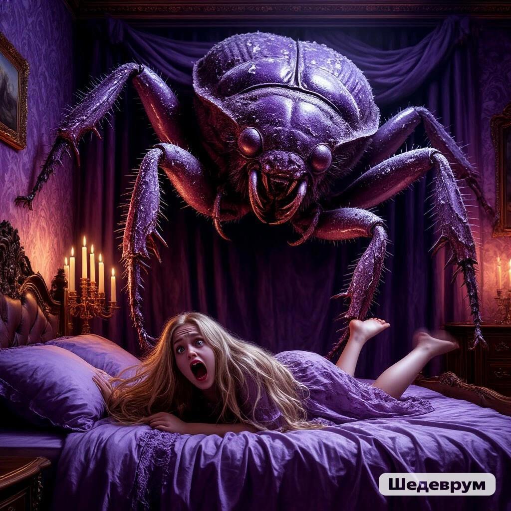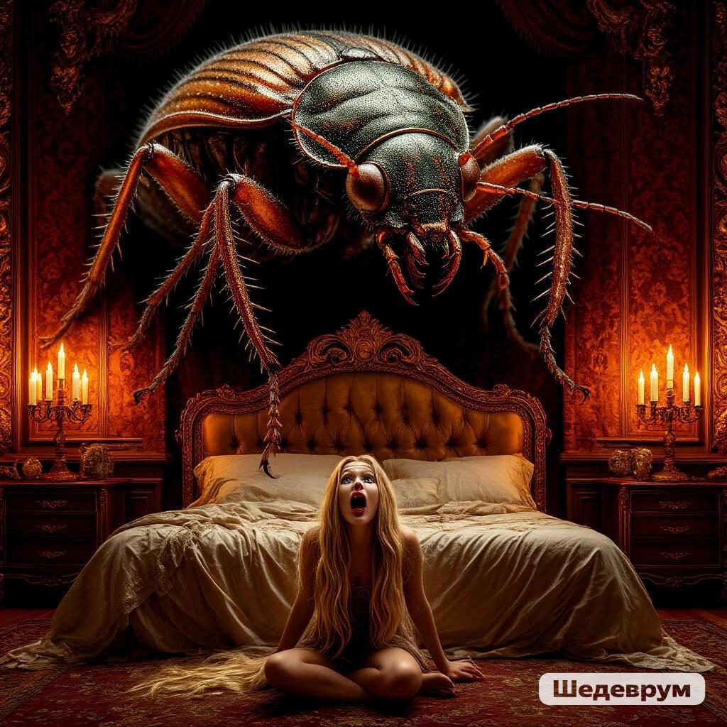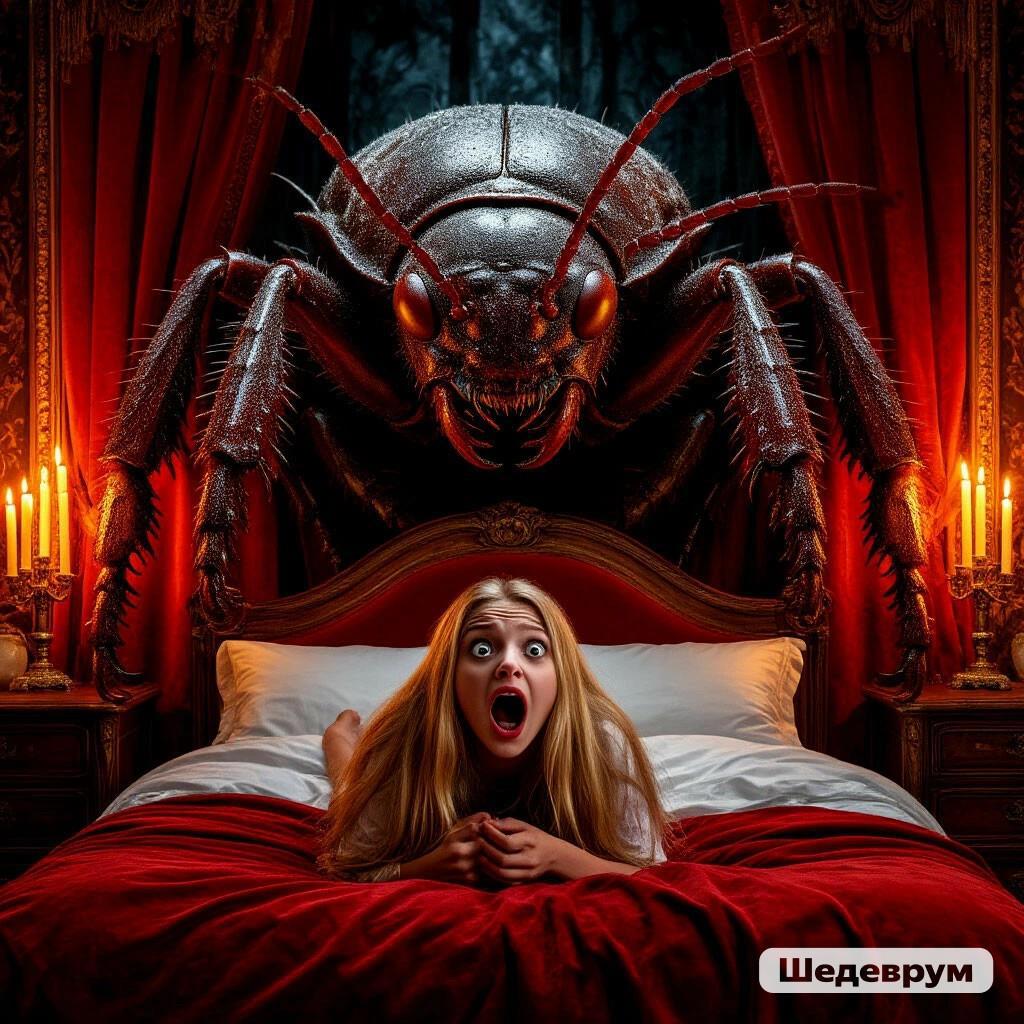 Её громкий крик на какую-то секунду или две остановил гигантского прусака. Но немного подумав и пошарив в воздухе усами, жук продолжил наступление. Одновременно до Янки дошло, что не нужно дожидаться подмоги, необходимо спасаться самостоятельно. Страх сковывал движения, но она повалилась набок в сторону левой кроватной панели и скатилась на пол. В тот же миг жирная чешуйчатая туша грузно рухнула на постель, прямо на шикарные розовые шёлковые простыни, что с любовью стелила в их с Агром любовный альков нежная Дива.