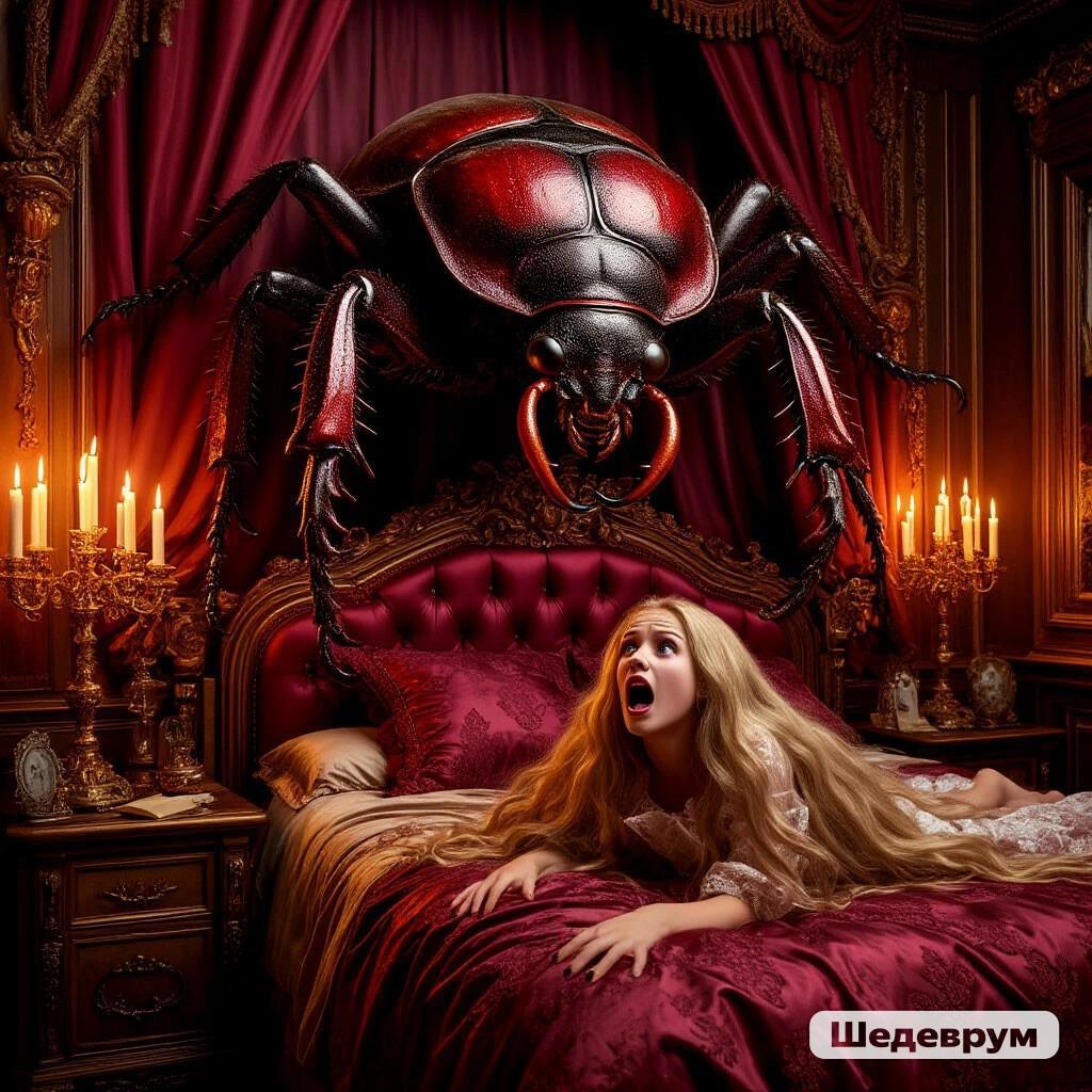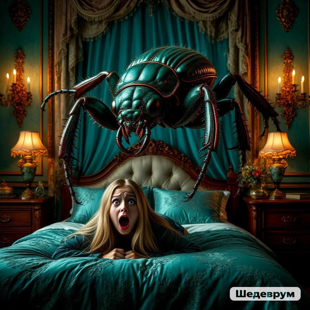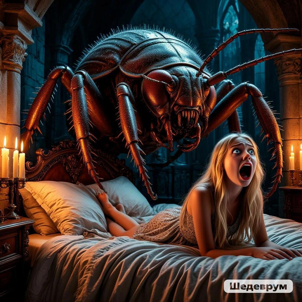 Она, невольно приоткрыв рот, смотрела на продолжающийся рост чудовища. Его длинные как шпаги усы уже достигли потолка спальни. Если бы монстр решил отдохнуть на их раздольной царственной кровати, то полностью на неё он бы вряд ли поместился. Но, видимо, именно эта крамольная идея и пришла в его тараканью голову. Словно только теперь разглядев Янку, он полез на неё, шаря впереди себя усами, как слепые ощупывают путь белыми тросточками. Девушка заорала, будто её режут.