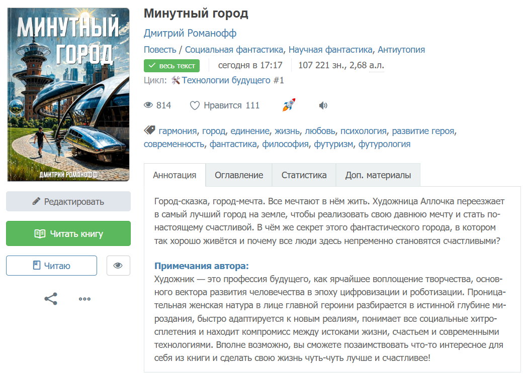 Закончена работа над книгой "Минутный город". Это была экспериментальная работа, над которой я трудился в свободное время. Смысл книги в том, что бы попытаться поспекулировать ближайшими технологиями, как будет жить человек будущего. Какие технологии могут быть особо востребованы, какую роль будут играть робопитомцы и как вообще будет житься в таком городе. Сможет ли человек найти в нём гармонию, единение и счастье. Интересна эта книга может быть тем, что я пытался использовать технологии убеждения, взятые из моей работы в области программирования и финансов и перенести их в художественную литературу. Что получилось, решать Вам! По этой книге есть целый ряд статей в блоге и я готовлю расширенную версию о том, как книга писалась, как что просчитывалось и т.д. Статьи в блоге вызывали интерес, так что возможно инсайды создания книги также могут быть полезны кому-то.