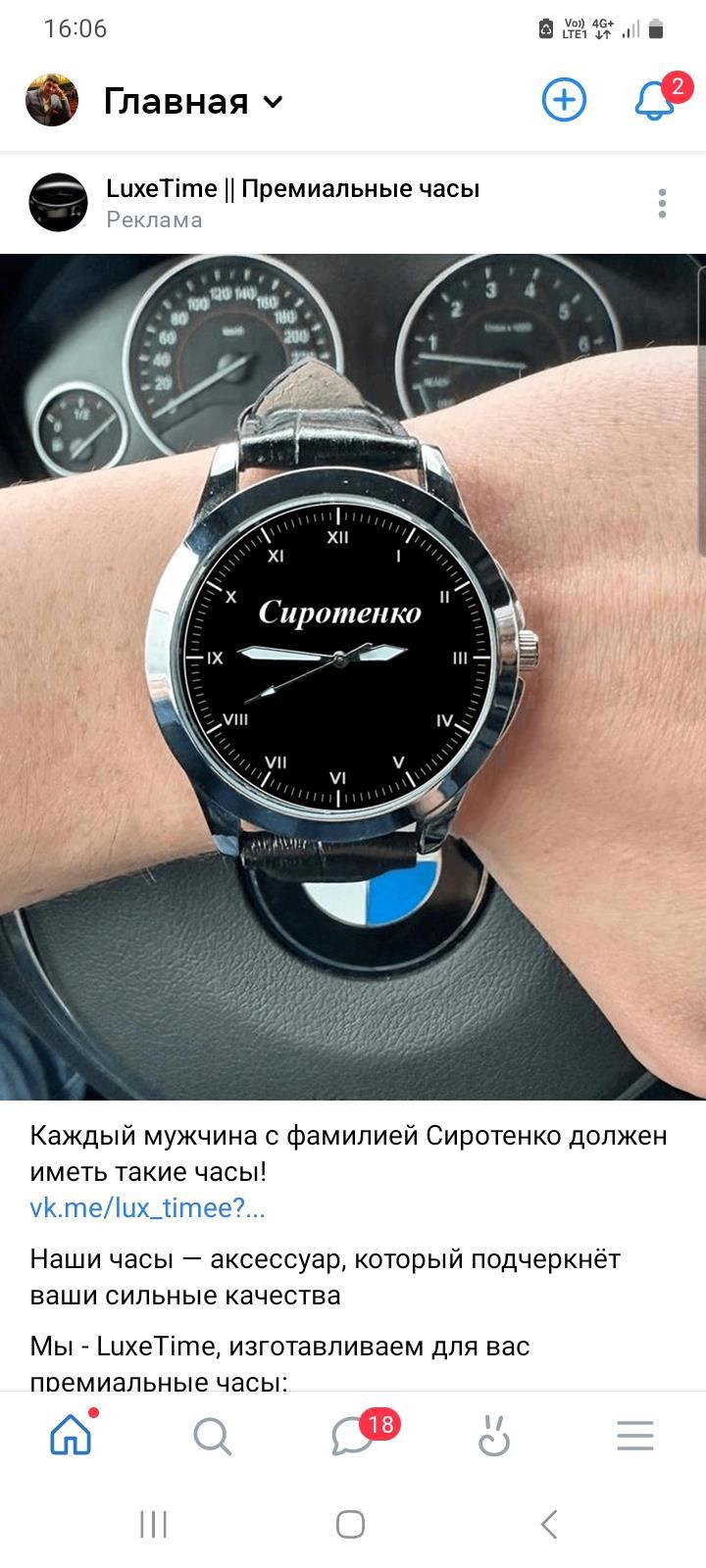 Но вот такая реклама, которую я поймал в ВК, это верх идиотизма :) часы, которые должен носить любой мужчина с фамилией Сиротенко :) вы часы эти видели?) LuxeTime, блин ) и на циферблате фамилия. Мне всегда интересно посмотреть на того, кто такое придумывает, и на того, кто такое запускает в ход. Посмотреть и спросить: "Ребята, а на кого это рассчитано? Можете описать в двух словах".