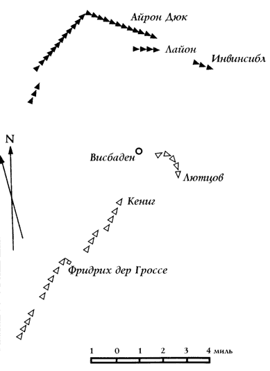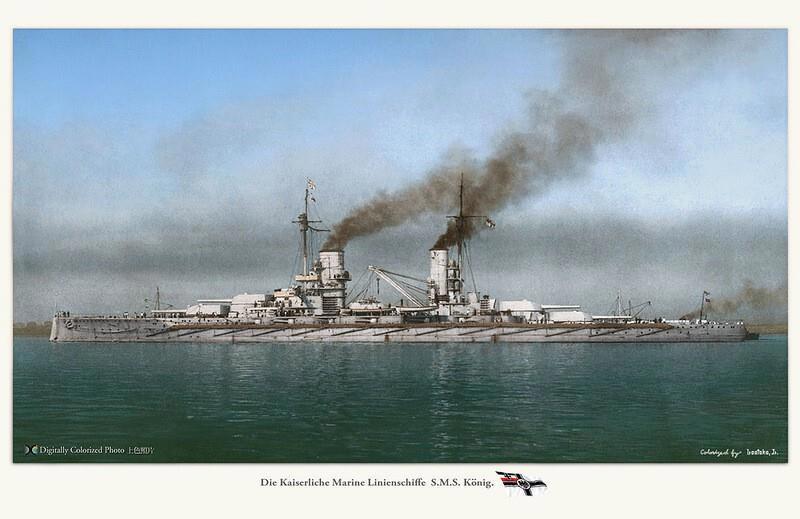 3 эскадра линкоров: "Кениг", "Гросер Курфюст", "Маркграф", "Кронпринц", "Кайзер", "Принцрегент Леопольд", "Кайзерин", "Фридерик дер. Гроссе".