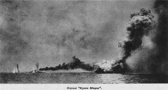 В это время линейный крейсер "Лайон" снова занял свое место в строю. Но "Дерфлингер" продолжал обстреливать "Куин Мери". Пока в 16 часов 26 минут не разыгралась вторая трагедия. 11 залп "Дефленгера" поразил "Куин Мери" (6*). Взрыв боезапаса так разнес корабль на части, что следующий в строю "Тайгер" был засыпан обломками. Но когда через несколько минут "Тайгер" прошел через место гибели "Куин Мери", то ни обнаружил никаких следов погибшего линейного крейсера. А столб дыма от взрыва "Куин Мери" взметнулся ввысь на пол километра. В течение 38 секунд погибло 1266 английских моряков (7*). Но, не смотря на столь тяжелые потери англичане, продолжали бой. И даже увеличили свои силы. К английским линейным крейсерам присоедининилась 5 эскадра линейных кораблей.