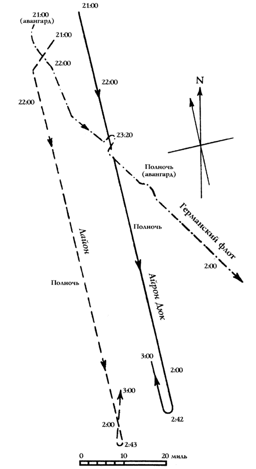 Приблизительно в это время Флот Открытого Моря пересёк курс Гранд Флита. Находясь на расстоянии около двух миль от последнего линкора Гранд Флита. И с линкоров 5 эскадры видели атаки эсминцев. А на одном из линкоров даже опознали противника. Но в ходе сражения командующий Гранд Флитом адмирал Джеллико так и не узнал, ни об боях лёгких сил флота с немецкими линкорами, ни о том что эти самые линкоры прошли мимо орудий вверенного ему линкора. Причём буквально на дистанции прямого выстрела. Бессмысленно продолжая поиски немецкого флота. С этого момента только удаляясь от Флота Открытого Моря.