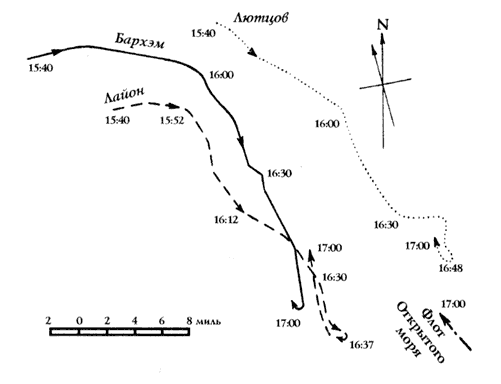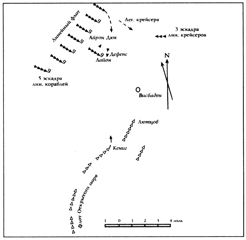 В тоже время на горизонте показались главные силы германского флот. Адмирал Битти повернул на север. Немецкие корабли, отражая атаки английских эсминцев, пошли в след врагу строем фронта. Германский флот имел подавляющее превосходство во всем, кроме скорости хода. Воспользовавшись этим адмирал Битти вывел свои линейные крейсера из-под огня противника.