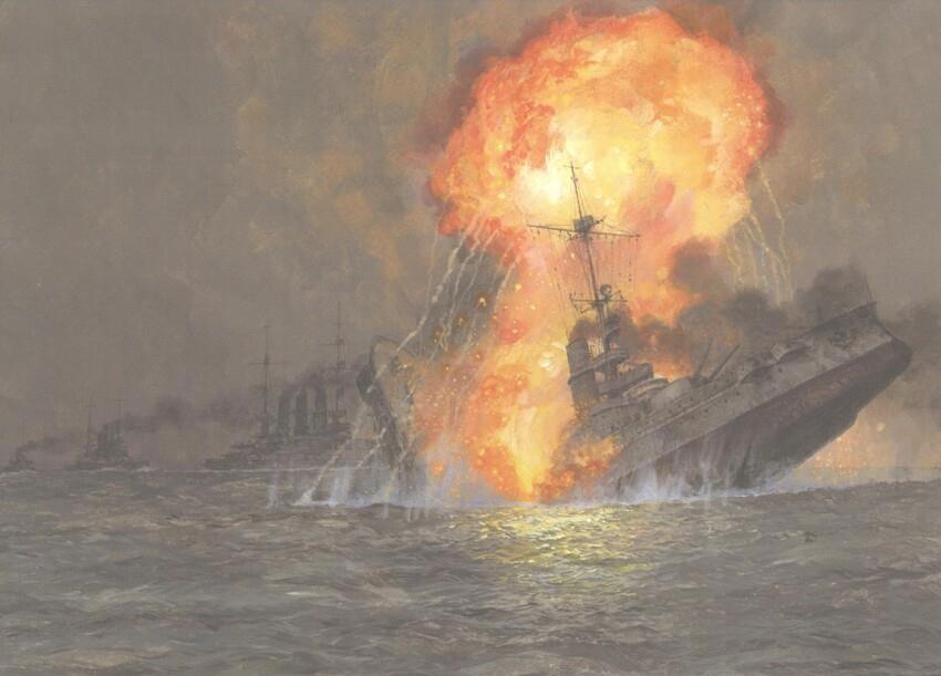 Но англичане быстро расквитались за эту потерю. В 0 часов 45 минут в атаку вышла 12 флотилия эсминцев, возглавляемая скаутом (11*) "Итурлинг". Через 20 минут одна из выпущенных торпед попала в устаревший линкор "Померн". От взрыва сдетонировал боезапас и корабль почти мгновенно исчез в огромном облаке дыма. Вместе с кораблем погиб и его экипаж - 840 человек. Это была самая тяжелая потеря Военно-Морского Флота Германии в Ютланском сражении. Кроме линкора, в этом последнем столкновении флотов, погиб, со всем экипажем, немецкий эсминец "V-4".