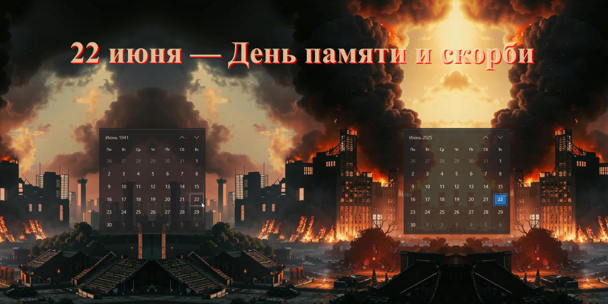 22 июня - День памяти и скорби. 22 июня 1941 года - дата начала Великой Отечественной войны. Это одна из самых печальных дат в истории нашей страны. Миллионы людей погибли в жестоких боях, были замучены в фашистском плену, умерли в тылу от голода и болезней. В этот день мы скорбим по всем, кто отдал свою жизнь, защищая своё Отечество. В текущем 2025 году 22 июня пришлось на воскресенье, как и в далёком 1941 году.