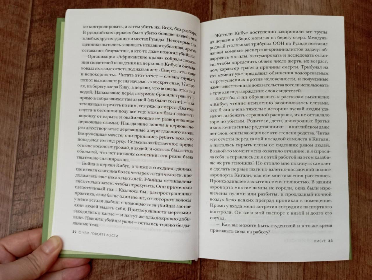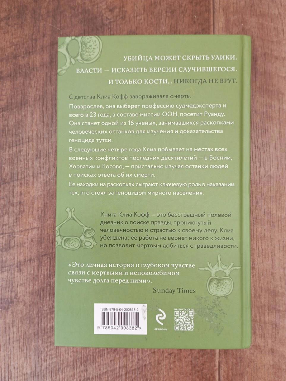 Кстати, Клиа честно пишет о сложностях: о проблемах с коллегами и ссорах, о нехватке оборудования, о бюрократии, о многочисленных опасностях на месте, о своих страхах и неурядицах. А ещё больше проникаешься уважением к автору, когда понимаешь, что Клиа действительно верит, что её работа помогает мёртвым как бы заговорить, рассказать свою печальную историю, и это поможет наказать преступников и восстановить справедливость.