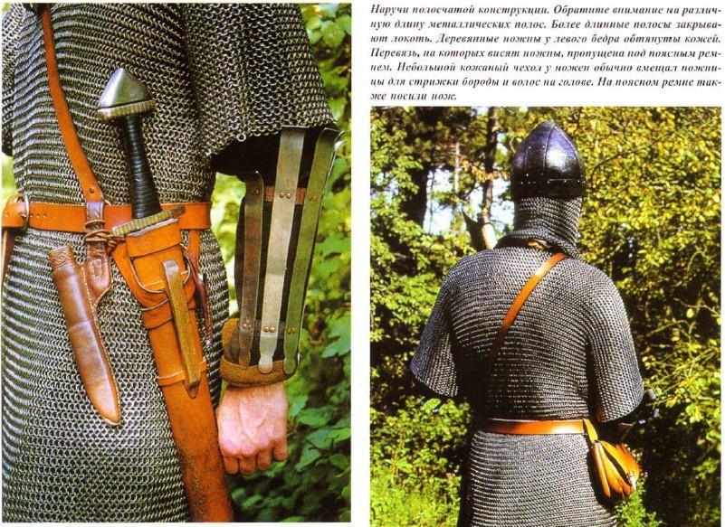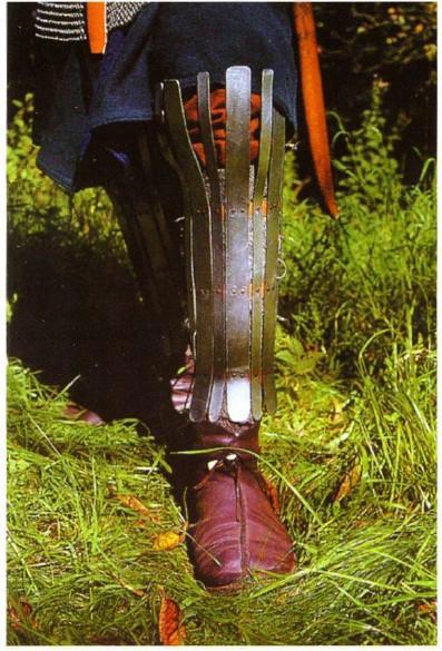 С кольчугой могли использоваться и полосчатые наручи и поножи. Которые собирались из металлических полос, разной длинны и шириной около полудюйма. Крепились подобные наручи и поножи кожаными ремнями. Есть сведения и о доспехах созданных по подобной технологии, но они не нашли широкого применения в Европе. Но были широко распространены в Африке. Где материалом для подобного рода доспехов служили доски из твёрдых пород дерева. И которые достаточно хорошо защищали от оружия сделанного, в лучшем случае из мягкого железа, бронзы, а то и из кремния или того же самого дерева.