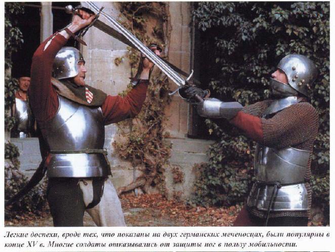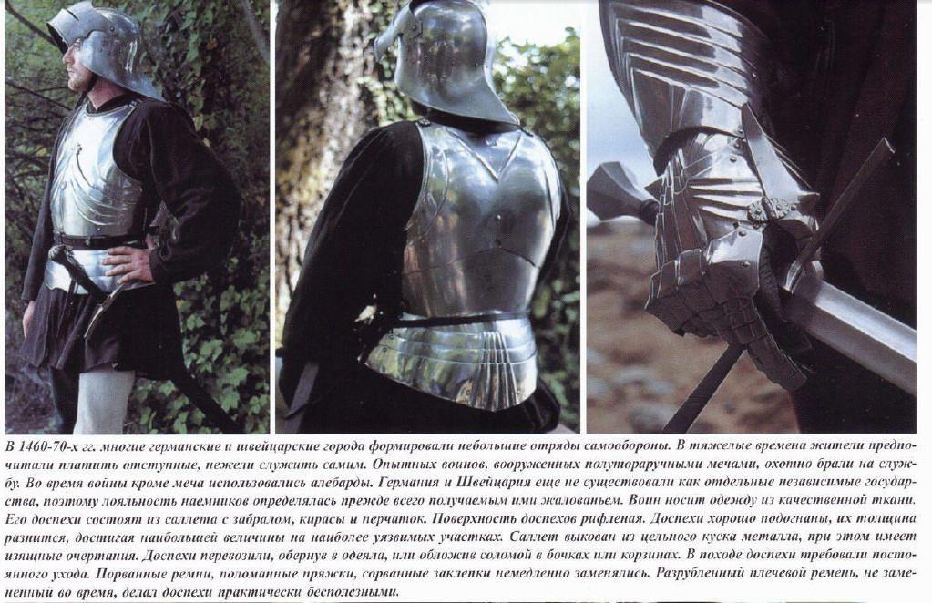 К сожалению, подобная броня имела и недостатки, из которых наиболее весомый, причём весомый в буквальном смысле - нагрузка на воина. Весил панцирь до 25 кг. Если же под него надевалась кольчуга, что было общепринято до конца 15 века, то общая масса защитного снаряжения достигала 32 килограммов! Воин, закованный в такие тяжелые доспехи, был существенно ограничен в подвижности. В индивидуальном пешем бою латы скорее мешали, чем помогали. В этом случае встреча с легковооруженным противником, располагающим длинным оружием большой пробивной силы, ничего хорошего одинокому пешему рыцарю не сулила.