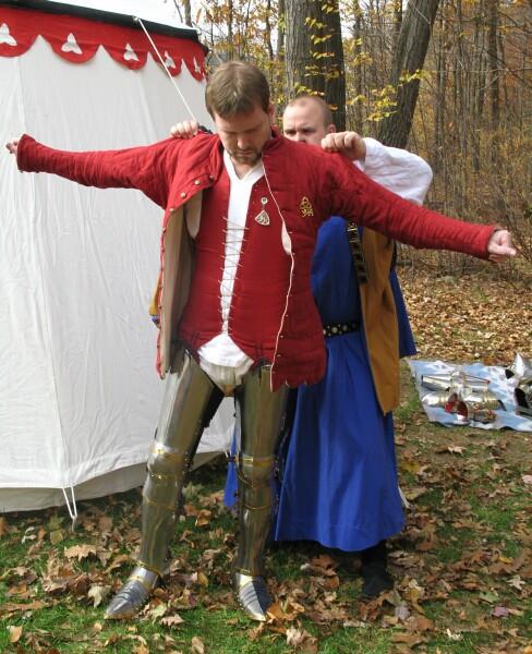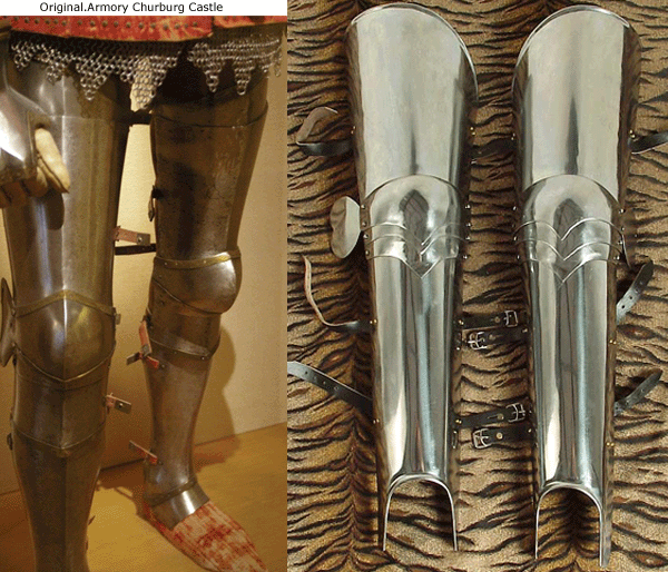 Облегающие кольчужные "шорты" привязывались к рейтузам ремешками. Затем одевали поножи, защищавшие голень. Далее следовали наколенники и набедренники, которые не только крепились ремнями к ноге, но и ещё подвязывались к верхней части чулок. Завершали защиту ног сабатоны - латный ботинки, Крепившиеся к наголеннику.