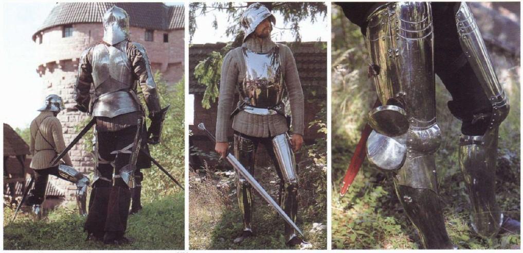 В Европе же, еще с 13 века, кольчуги усиливали обширными наплечными и нагрудными пластинами (когда воину, владельцу доспехов, это позволяли средства). Кроме нагрудников и наплечников, из сплошного металла изготавливались наручи, поножи, набедренники и иные элементы. Чаще всего сплошные элементы брони дополнялись кольчужными или кожаными фрагментами. В Европе рано оценили преимущества жесткого бронирования. Мастера не прекращали воплощать новые идеи, пока не довели принцип до логического окончания, сделав латный доспех действительно сплошным.