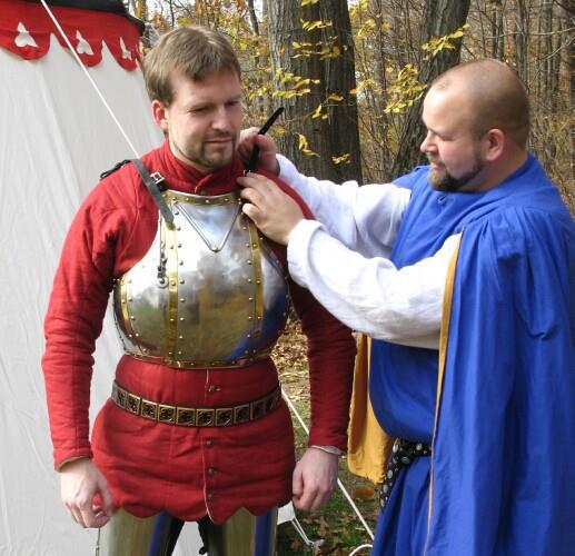 Латные доспехи можно было надеть практически только с посторонней помощью. И носились они только поверх специальной одежды. Подобной той, которую одевали и под кольчугу (повторяться не буду, смотрите мой предыдущий пост). Первым одевали пластинчатую или кольчужную горжету, застегивающуюся ремешками с пряжками сзади или сбоку, и представлявшая из себя выполненный из пластин стоячий воротник.