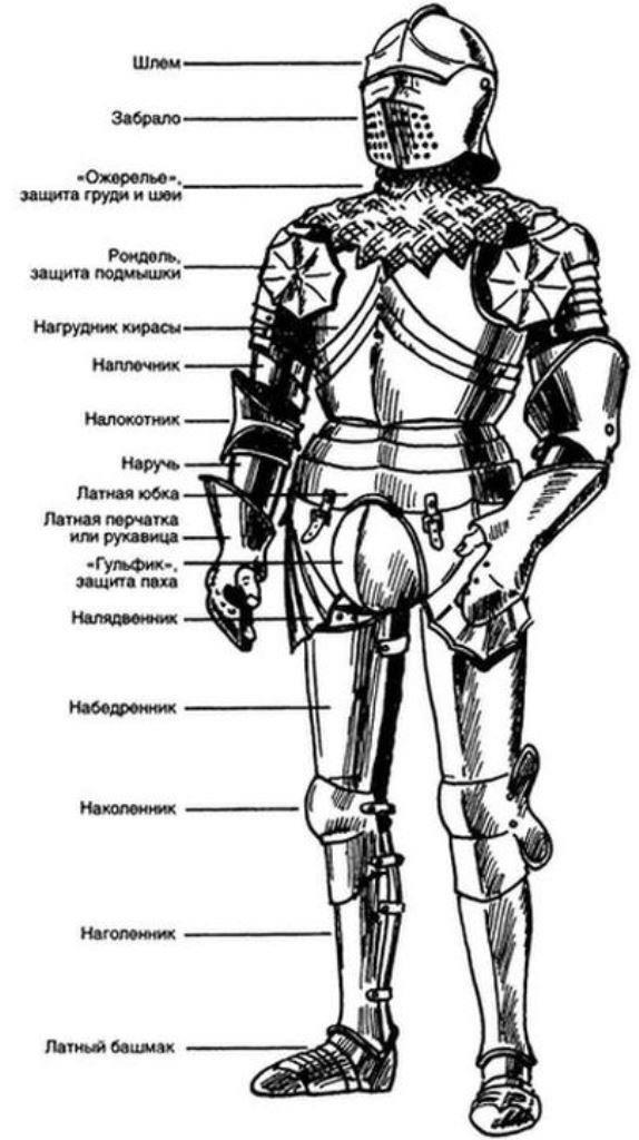 Как правило наручи состояли из четырёх деталей: оплечья, наплечника, налокотника и непосредственно самого наруча. Последними одевали латные перчатки. Шпоры, шлем, щит и оружие довершали экипировку. Но так воина снаряжали для конного боя. Для пешего боя старались снизить вес доспеха. Обычно отказываясь от защиты ног.