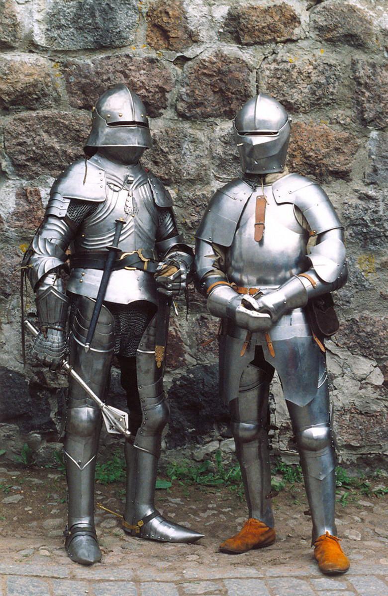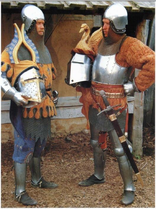 Но стандартные боевые доспехи этого периода оставались относительно лёгкими. И позволяли комфортно носить их в течение довольно продолжительного времени. Естественно, при условии что такие элементы, как шлем, рукавицы/перчатки и голени по возможности снимались. Такие доспехи имели грамотную систему крепления и распределения веса, тренированный человек практически не испытывал неудобств при обращении с ними и мог не только залезать и слезать с коня без помощи пажа, но и спокойно вести манёвренный пеший бой. Беспочвенен и миф о том, что упавший с седла в таких доспехах рыцарь не мог сам встать. Вставал, если не терял сознание от падения.