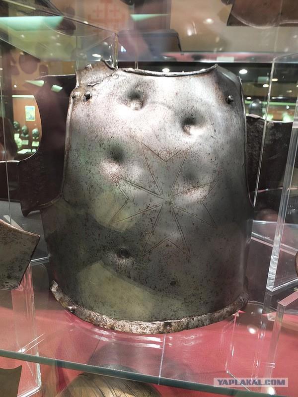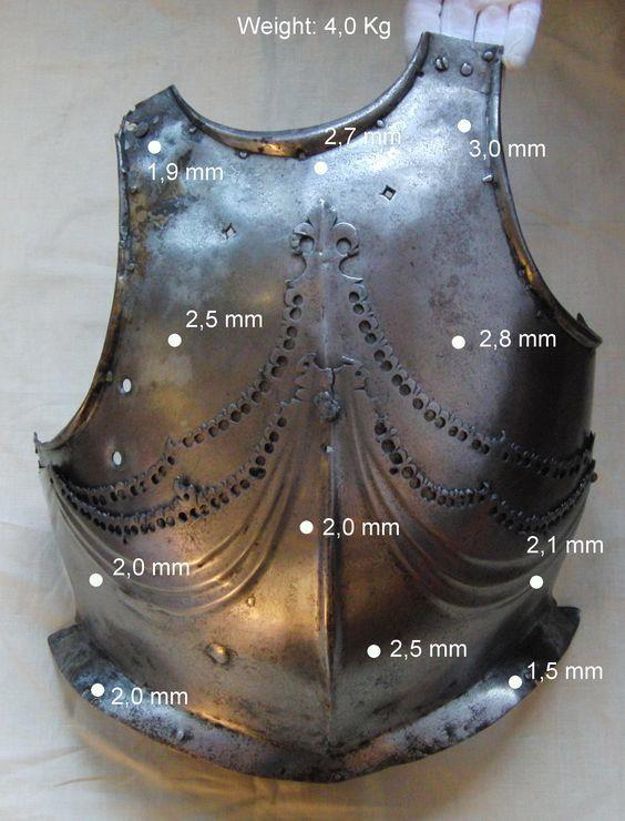 Толщина пластины кирасы в разных местах и её вес. И как мы видим доспех в двух местах пробит.
