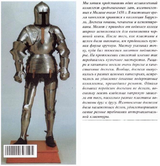 Доспехи 15 века ковались с помощью молота, с приводом от водяного колеса. Что позволяло делать пластины больших размеров. После того как пластины были выкованы, их доводили до нужной формы вручную. При этом пластины могли быть и не одинаковыми по толщине. Более толстый слой метала делался в наиболее ответственных местах доспеха. В Европе 15 века наибольшее распространение получили два типа доспехов округлые и гладкие "миланские", которые изготавливались в Милане и более рубленные и угловатые "готические", центрами изготовления которых стали Аусбург, Нюрберг и область Тироль. Что определялось качеством применяемого сырья. Доспехи остальных европейских стран ценились меньше. При этом наименьшую ценность имели английские доспехи.