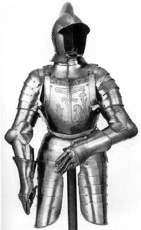 Помимо боевых или турнирных доспехов, в это же время появились и так называемые парадные или костюмные доспехи. Которые максимально облегчались, за счёт толщены метала. И отличались богатой отделкой, в том числе и гравировкой.