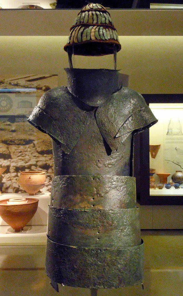 Хотя к самым первым латам можно отнести не только бронзовые анатомические доспехи Древней Греции, Рима и японский доспех танко. Но существовали и более древние доспехи. Появившиеся более 3500 лет назад. Как например вот эти найденный в гробнице Дендры-12 полный доспех воина (1450 - 1400 гг. до н.э.). Правда голову воина в таком доспехе покрывал ламеллярный шлем из нашитых на кожаную основу клыков кабана, но что есть, то есть.