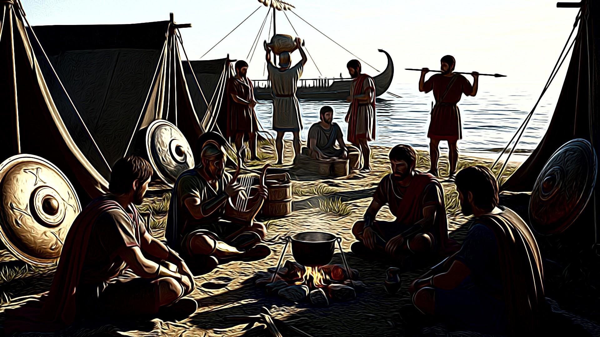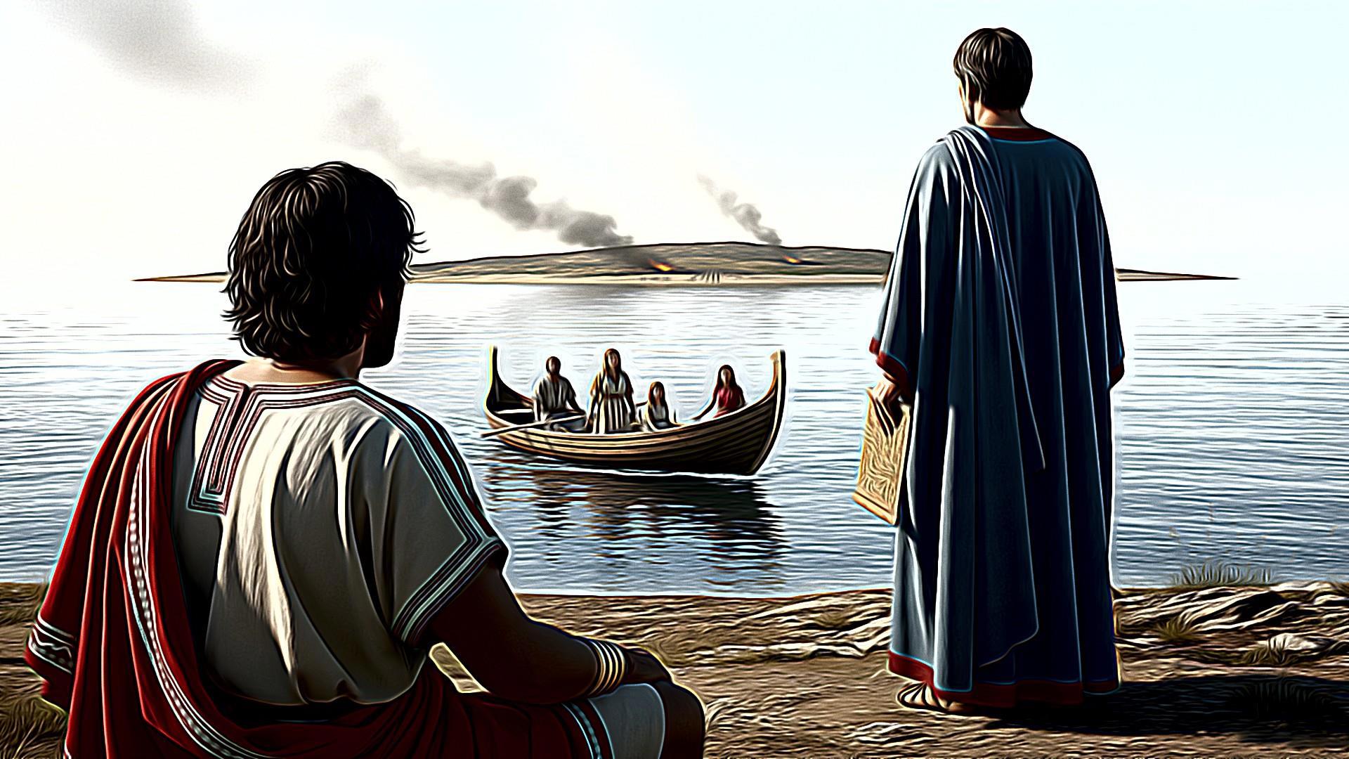 Хастияр и Хеттору алкогольно отдыхают на берегу (там еще слуга Хастияра Анцили, в кадр не попал). Хастияр читает письмо из дома. И вдруг они видят дым на острове Левкофрис (он же Тенедос). И лодку беженцев.