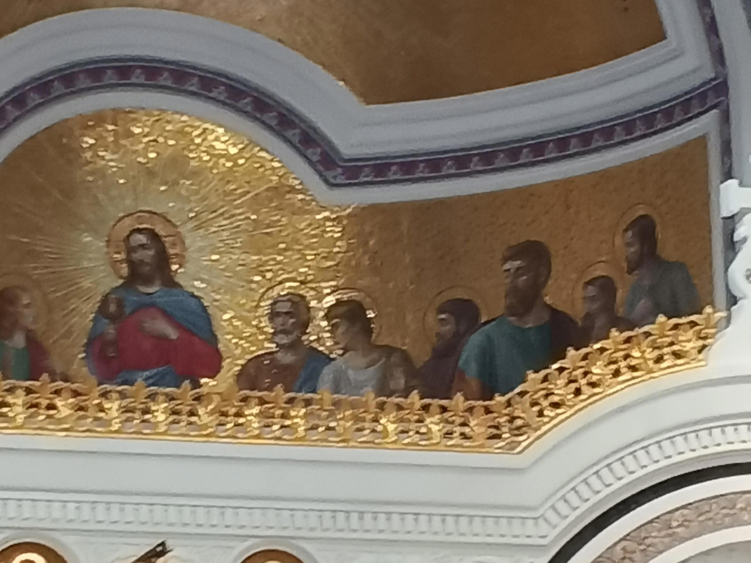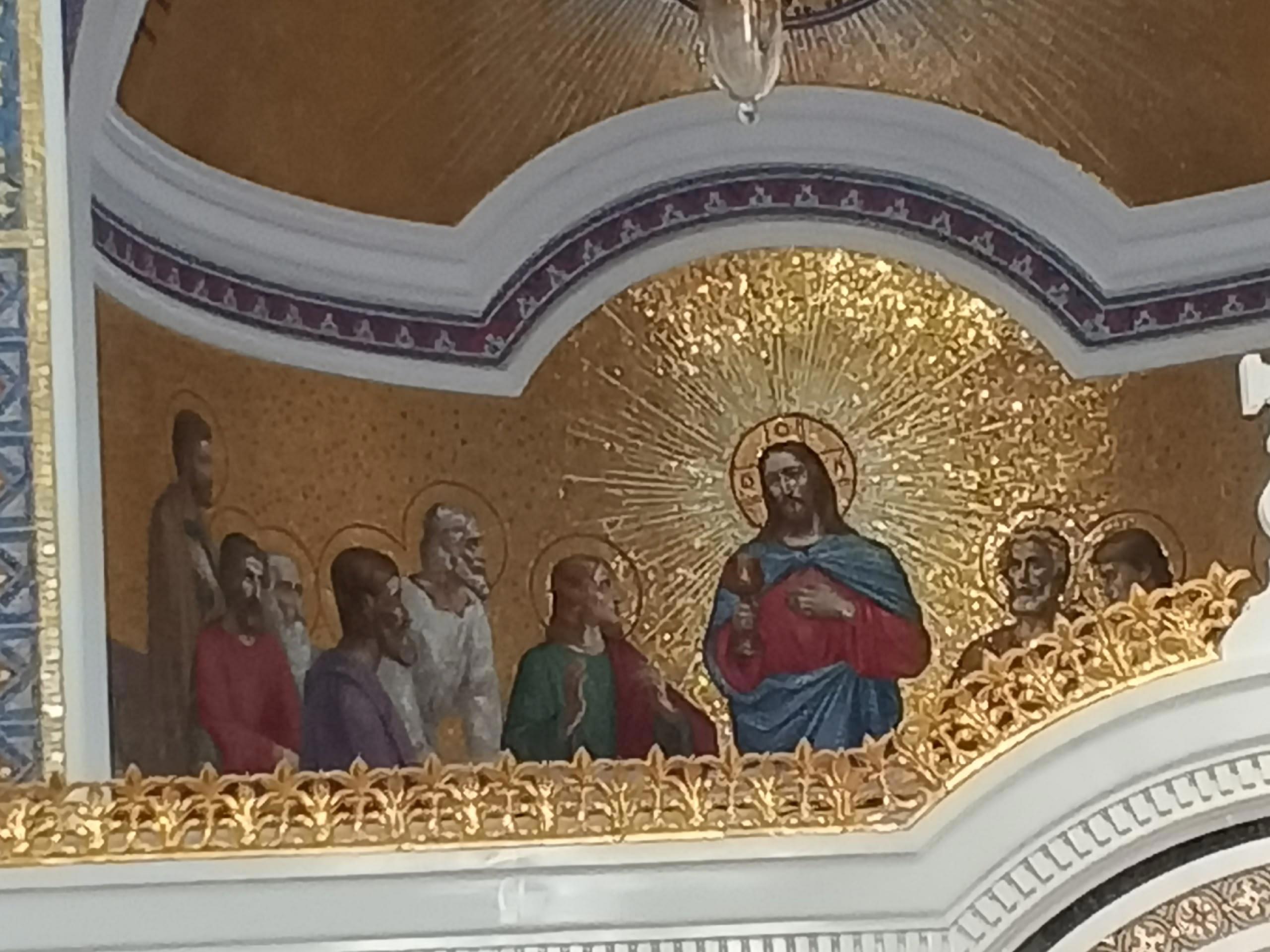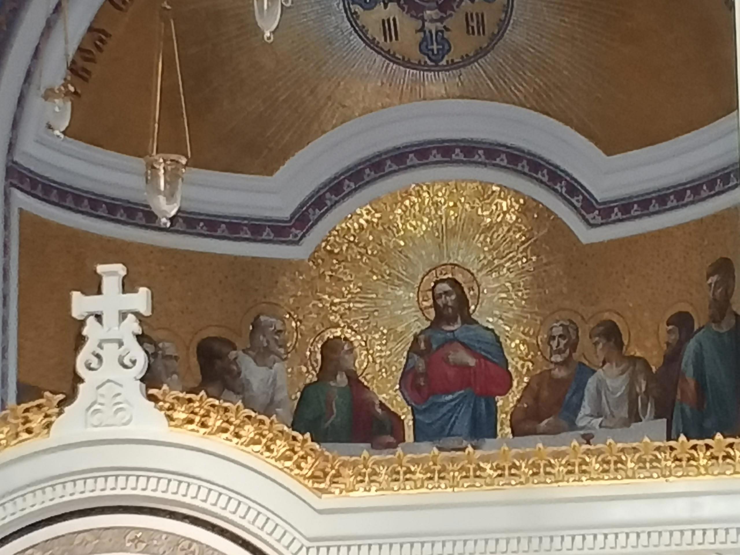 К сожалению прекрасную мозаику изображающую Тайную вечерю полностью сфотографировать не получается. Она перекрыта царскими вратами. Но что смогла снять, то и покажу вам.