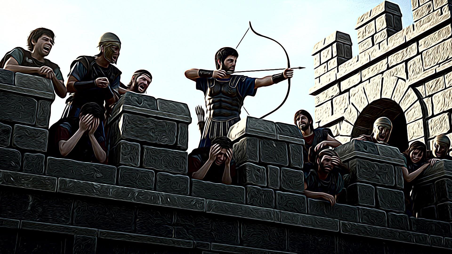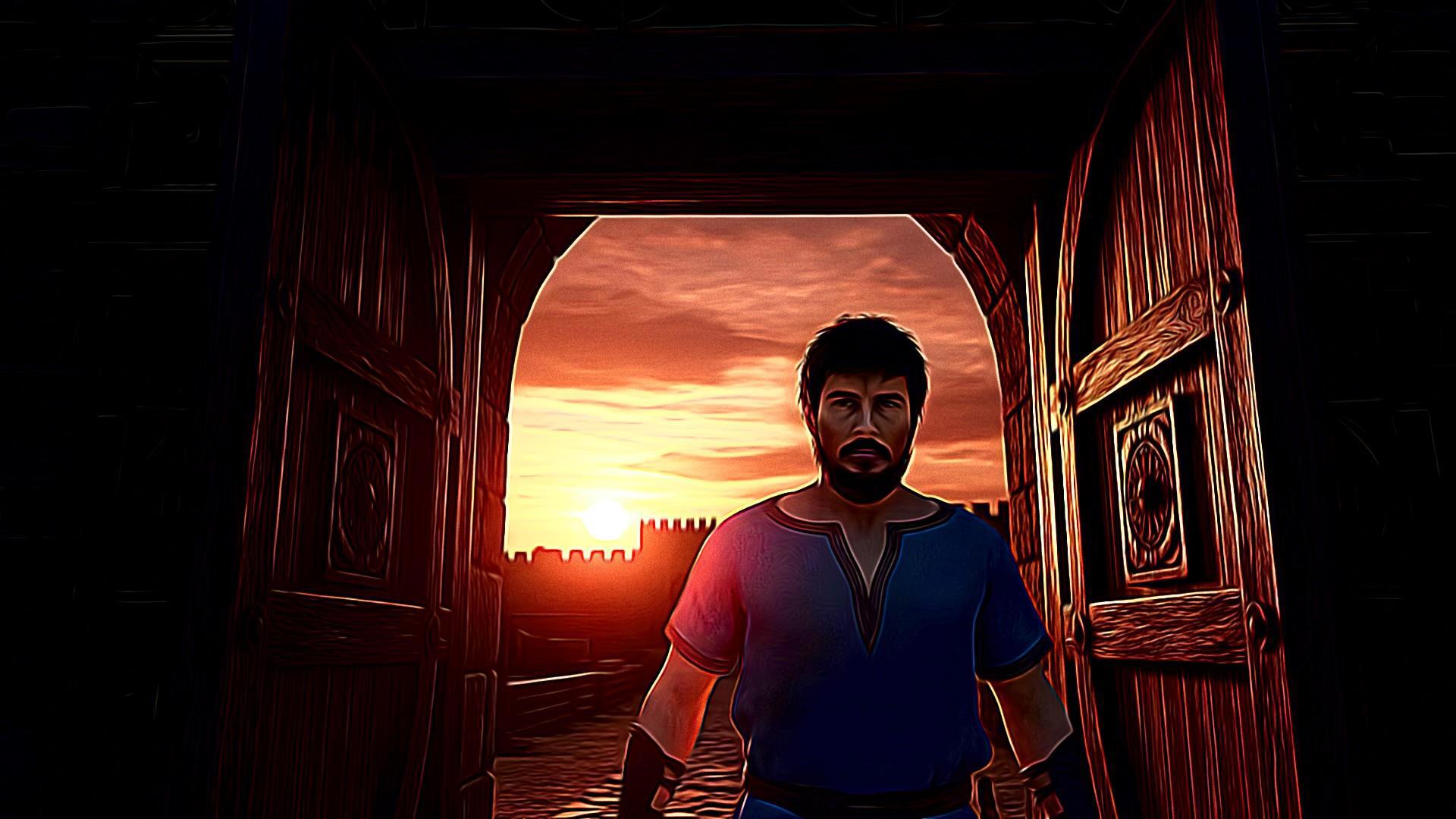 На иллюстрации есть косяк «ради красоты». Выходит Хастияр, скорее всего, через западные ворота, ведущие к морю. Поэтому заходящее солнце должно быть перед ним, а не за спиной.