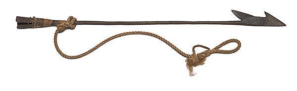 Ну и последняя разновидность древкового метательного оружия - гарпун. Хотя это скорее не оружие, а орудие, употребляемое для охоты. Оно похоже на дротик. Его отличительной особенностью является то, что его тяжёлый (до нескольких килограмм) наконечник, обычно снабженный еще боковыми, загнутыми назад зубцами, неплотно соединен с древком и при ударе, попадая в тело, легко отделяется от древка, оставаясь соединенным с ним посредством прикрепленной к середине его веревки. Что сильно сковывает движения жертвы, вызывая к тому же сильную кровопотерю. И хотя ряд народов и применял гарпуны для своей защиты, но гарпуны ни когда не находились на вооружении армий.