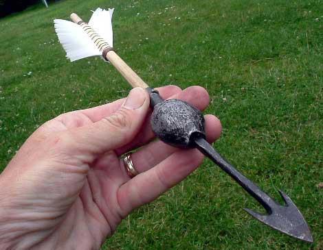 Такое устройство упрощало ношение, но вместе со свинцовым грузом сильно смещало центр тяжести к острию, что делало необходимым применение для стабилизации оперения. Существовали как легкие (0.2 кг), так и бронебойные (более 0.7 кг) образцы этого оружия. Метались "свинчатки" на дистанцию до 60 м.