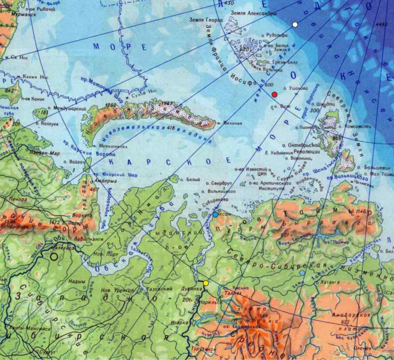 Желтой точкой я пометил место где состоялась встреча Нансена с ученым. Синяя точка — место куда он хотел попасть в надежде на встречу с экспедицией Брусилова.
