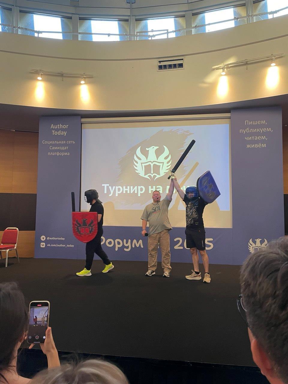 Честно, было классно! С удовольствием пообщался со старыми друзьями и познакомился с новыми. Было много интересных бесед о книгах, продвижении, комиксах, кино. Был приятно удивлен комплиментарными отзывами о своем творчестве от коллег. Ну и сделал несколько фотографий с приглашенными звездами.На второй день Василий Маханенко провел турнир по бою на мечах, призом которого были объявлены рекомендации от «трех топов и Прокофьева». Я об этом узнал постфактум, но деваться некуда, ловите фото и имена победителей – думаю, у людей, прошедших столь жесткую турнирную сетку, и в книгах все отлично -)