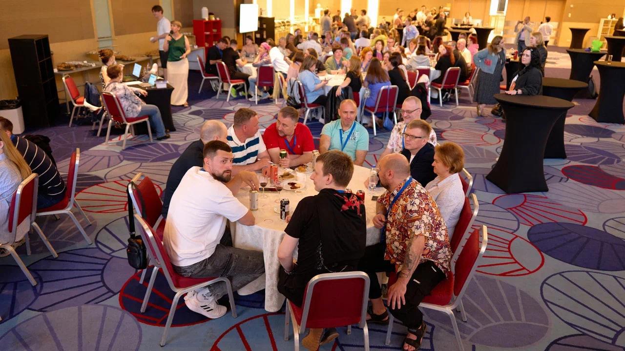 Вообще все было на очень высоком уровне – начиная от встречи гостей, продолжая программой мероприятий, фотозоной, кофе-брейками, фуршетами и заканчивая экскурсией в Петергоф на трех автобусах. Про праздничный банкет отдельно напишу ниже.