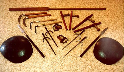 Хотя с тонфой вопрос сложнее. Китайцы считают, что тонфа была создана на основе костыля. Что вроде бы как превращает это оружие в разновидность посоха. Но на Окинаве считают (и пожалуй это более вероятно), что тонфа была разработана на основе деревянной ручки жернова, распространённого сельскохозяйственного инструмента. Многие народы использовали и используют тонфу по прямому сельскохозяйственному назначению. Но вот однажды какой-то мирный крестьянин, ведомый инстинктом самосохранения, хватается за рукоятку тонфы, извлекает её из жернова и бросается на обидчиков. Такое могло случиться в любое время и в любую эпоху. Но именно на острове Окинава, имело место систематическое применение мирного черенка в военных целях. И тут есть косвенное подтверждение, что основоположниками такого применения тонфы были именно дворяне. Основатели всех школ и авторы всех тактатов, по применению тонфы, имели благородное происхождения. Среди них нет ни одного простого крестьянина.