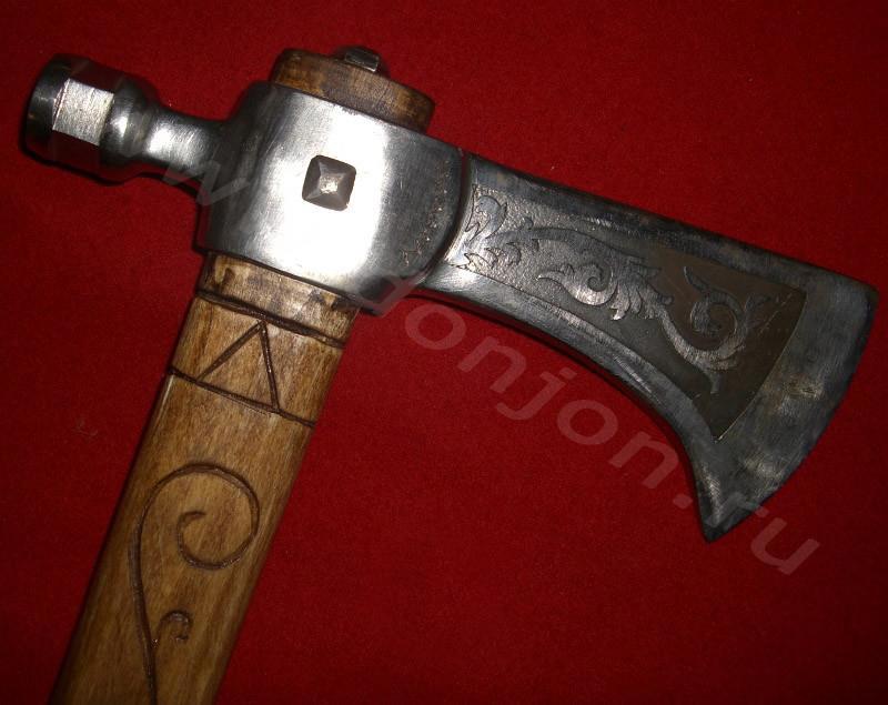 При этом можно сказать, что именно топор стал символом викинга. В первых походах викинги использовали обычные колуны. Потом появились "бородатые топоры", которые имели специальные накладки, защищавшие топорища.