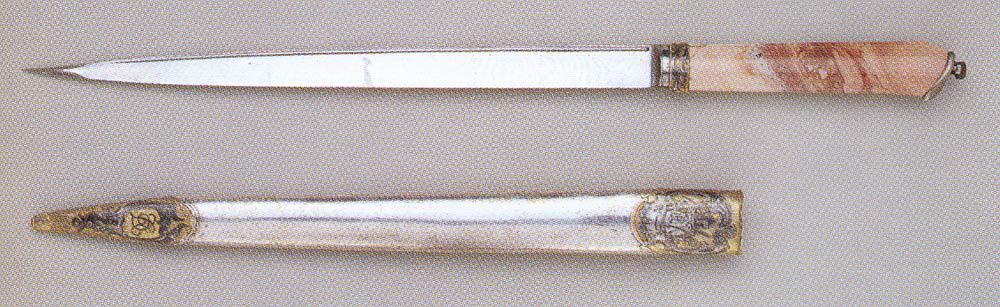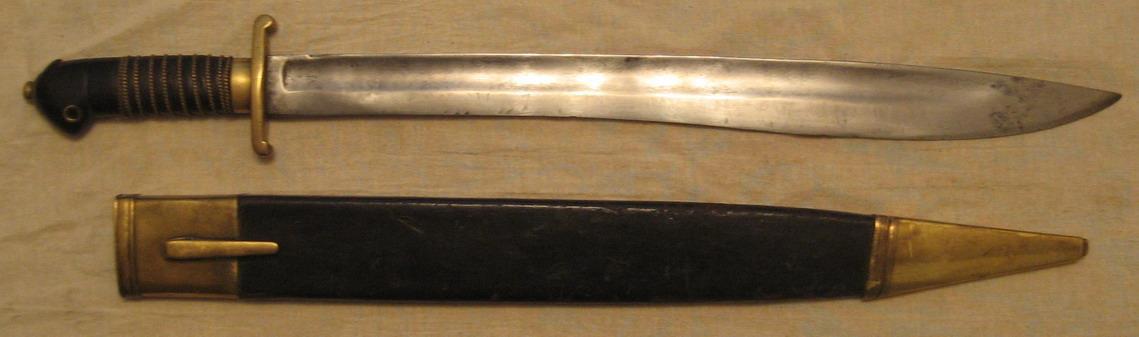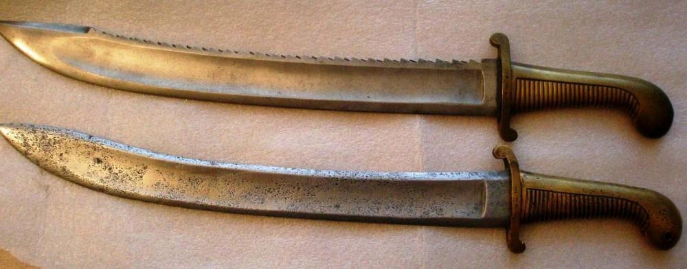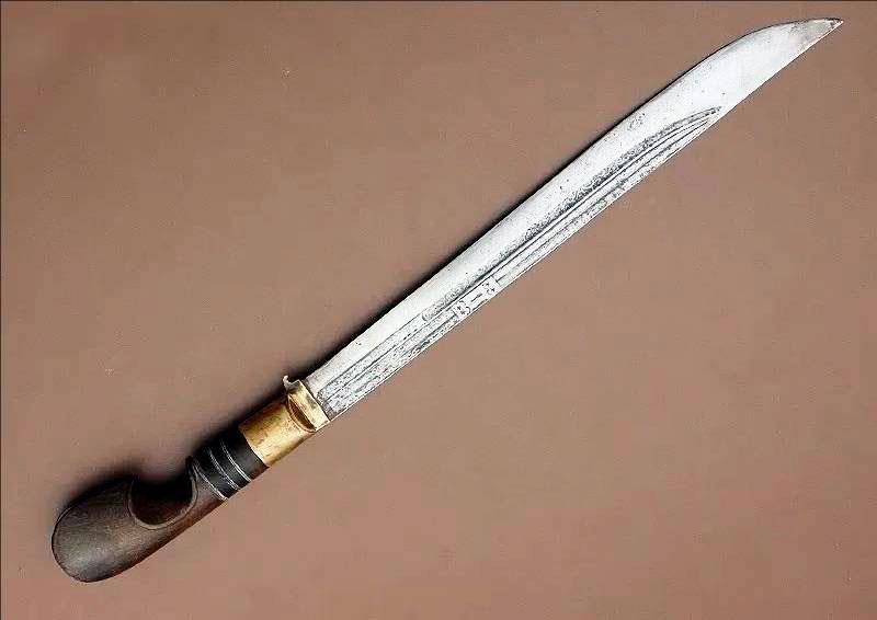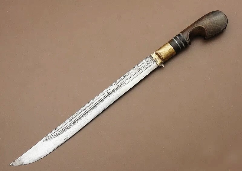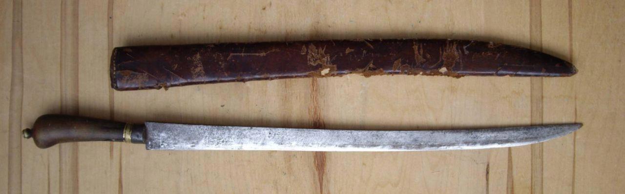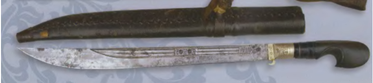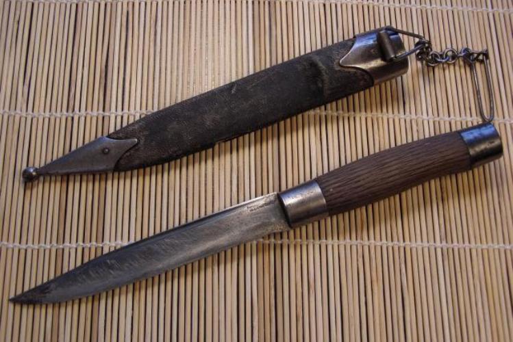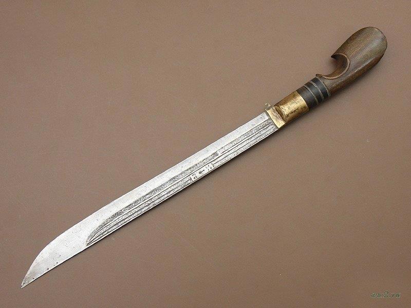 И считается что это изначальная форма таких ножей. В большинстве своем они не были "переделками шашек", хотя теоретически такие переделки могли существовать - просто потому, что сломанное длинноклинковое переделывалось на ножи, кинжалы и тесаки всегда и везде. Но "шашечная" рукоять в данном случае не говорит о том, что шашка произошла от такого ножа. Все сохранившиеся такие ножи - поздние, XIX века. Форма рукояти говорит лишь о наличии устоявшейся традиции и моды на подобное оружие. Но мы имеем то же утапливание в ножны, те же "ушки" на головке рукояти. В общем приемственность просматривается