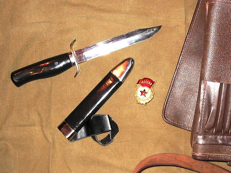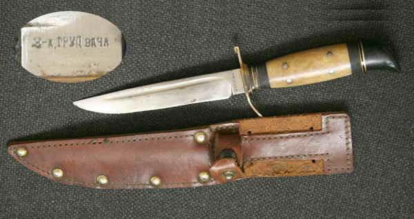 Особых слов заслуживает исполнение рукояти. Самые простые модели имели цельную деревянную, пластмассовую или текстолитовую рукоять, насаженную на хвостовик с заделкой на головке. Реже встречался пластинчатый монтаж со щечками, приклепанными к широкому хвостовику. Самыми популярными были разноцветные наборные рукояти из авиационного целлулоида, органического стекла, текстолита и гетинакса. На головке и прочих деталях рукояти мог использоваться авиационный алюминий и латунь. К тому же на головке рукояти всегда имелся упор для пальцев. Ножны - кожаные с боковым швом (со стороны лезвия) с кожаным ремешком для ношения на поясном ремне. Часто нож носился за голенищем сапога.