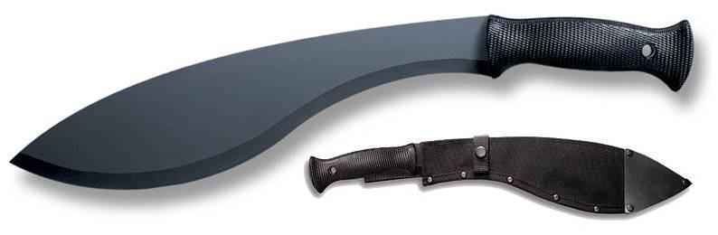 Но не всегда ножи "вырастали" во что то другое. Существует и обратный процесс. Непальский нож, именно нож, а не кинжал (заточен от только с одной стороны), кукри привлекает внимание большим обратным изгибом клинка. Это кажется странным: изгиб слишком велик и "поймать" противника вогнутой частью трудно. Неудобен кукри и для колющего удара. Фехтовать и парировать удары таким оружием также очень сложно. Но лезвие такой формы, да ещё с переменным углом заточки дает максимальную эффективность в рубящих и режущих. Клинок кукри имеет характерный профиль "крыла сокола", заточку по вогнутой грани и зонную закалку. У обуха клинок значительно мягче, чем у кромки лезвия. Для кукри характерны показатели твердости в 25-27 HRC у обуха, 46-48 HRC в середине клинка и 55-57 HRC у кромки лезвия либо 57-58 HRC у обуха и около 60 HRC на кромке лезвия. В противном случае отлом лезвия у рукояти, а на эту область клинка приходится максимальная нагрузка при рубящем ударе, неизбежен.