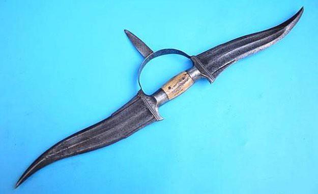 По изгибу своего клинка, восточный кинжал, есть подражание коровьему рогу, только в плоской форме (встречаются, впрочем, и круглые) и из стали. Это заставляет думать, что первобытный кинжал был ни что иное, как настоящий рог, предположение, подкрепляемое еще тем, что в отложениях палеолитической эпохи (во Франции) находили оленьи рога, отделанные в виде кинжала. Рога служили в качестве оружия и в более поздние эпохи; так, в Индии еще недавно было употребительно оружие из двух острых рогов, соединенных своими основаниями и прикрытых в этом месте круглой металлической бляхой для защиты руки. Таким орудием пользовались в рукопашном бою, для нанесения ударов направо и налево. Стальным аналогом этого оружия является бичва - два кинжала ганджир на одной рукояти.