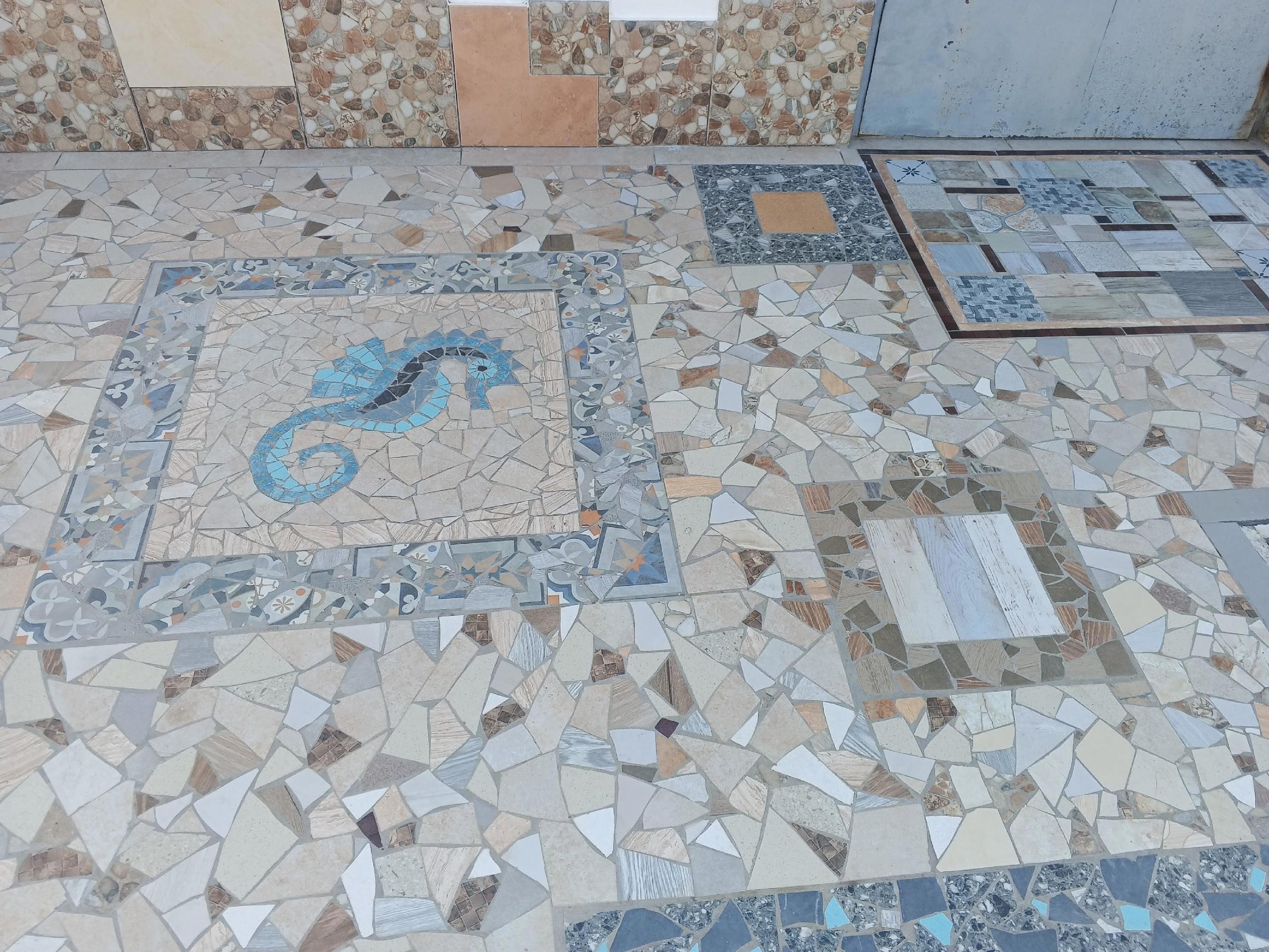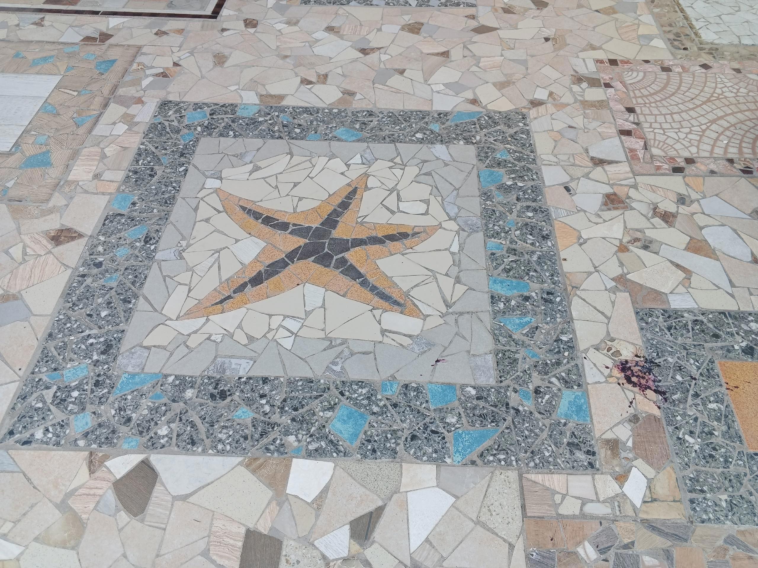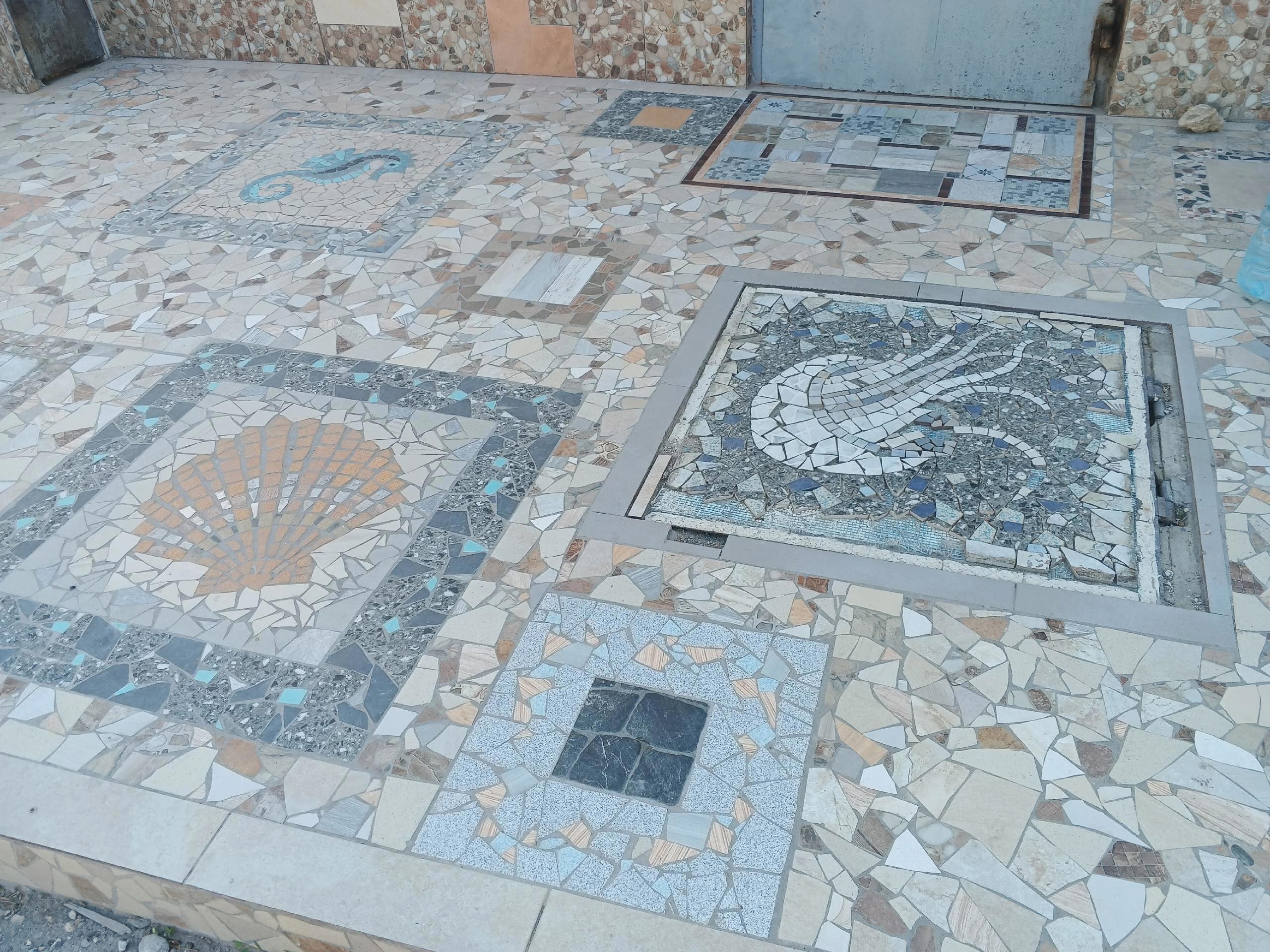 Позже мы обнаружили возле небольшого домика вот такую чудесную мозаику на тротуаре вдоль забора. Здесь выложены жители феодосийской бухты. Кроме...