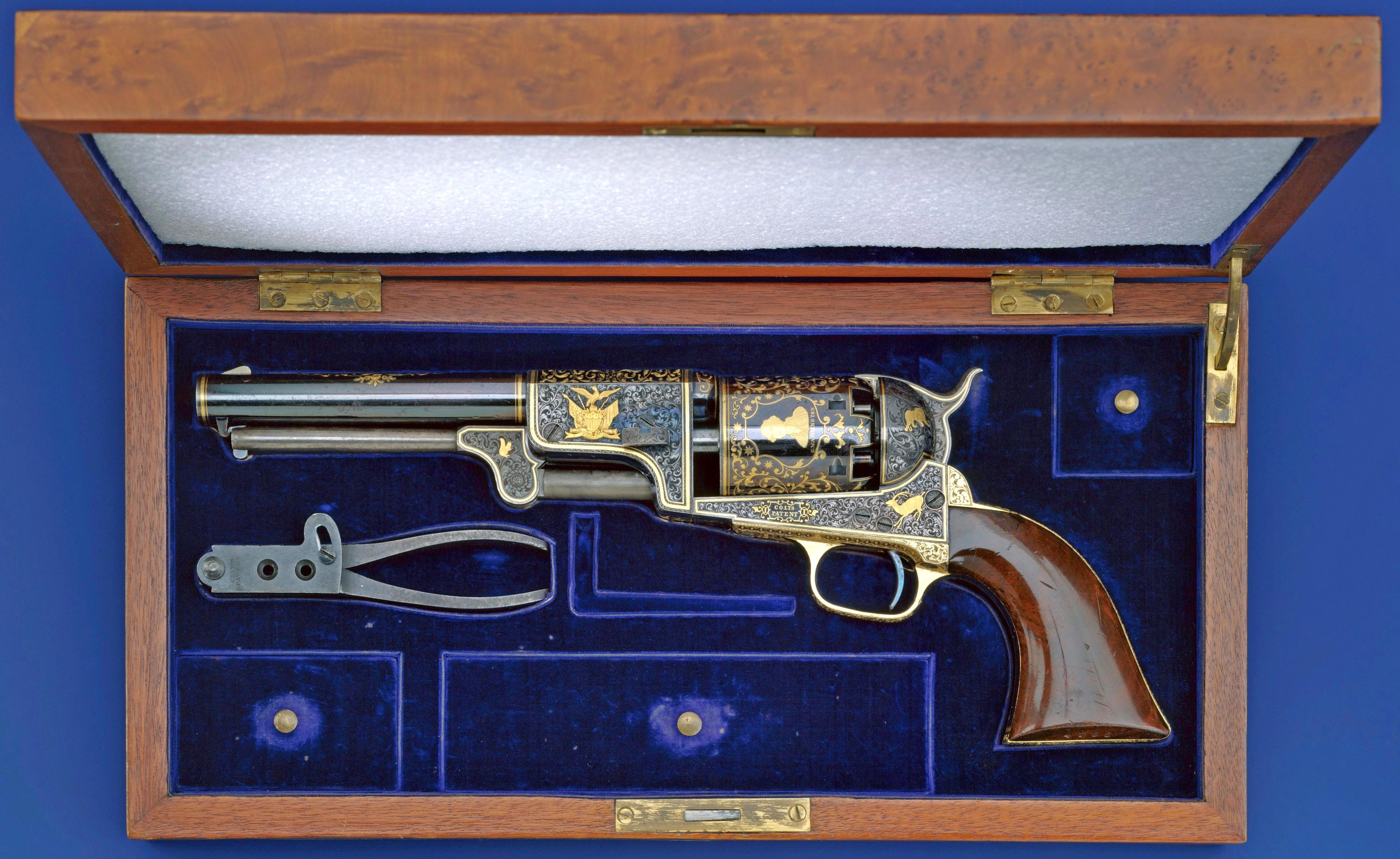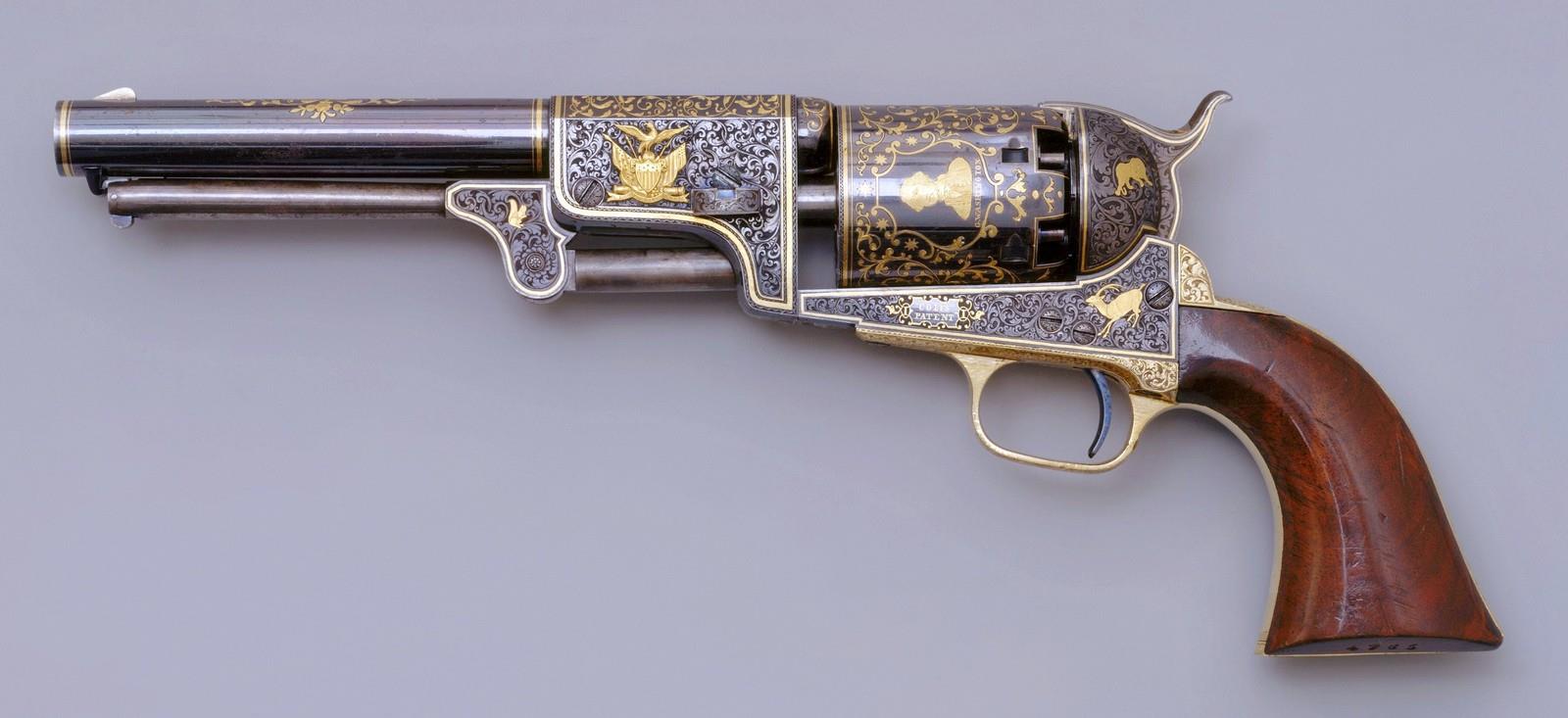 Неплохо в общем, хотя проблемы не решало. Все прекрасно знали, где решение, но не спешили. Решение было в револьверах. Они были особенно интересны как минимум для двух родов войск. Это для кавалерии всех мастей и для моряков. Им револьверы были очень нужны для абордажных боёв. Но стоили они очень дорого, да и заряжать их было всё равно долго. Приезжал Самюэль Кольт к Императору. Подарил ему набор своих револьверов. Вот один из них: