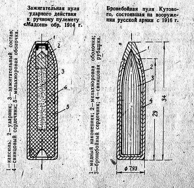 Патрон с зажигательной пулей ударного действия. Справа патрон с пулей с выступающим капсюлем для стрельбы по аэростатам противника. Слева патрон с утопленным капсюлем для стрельбы по аэропланам противника.