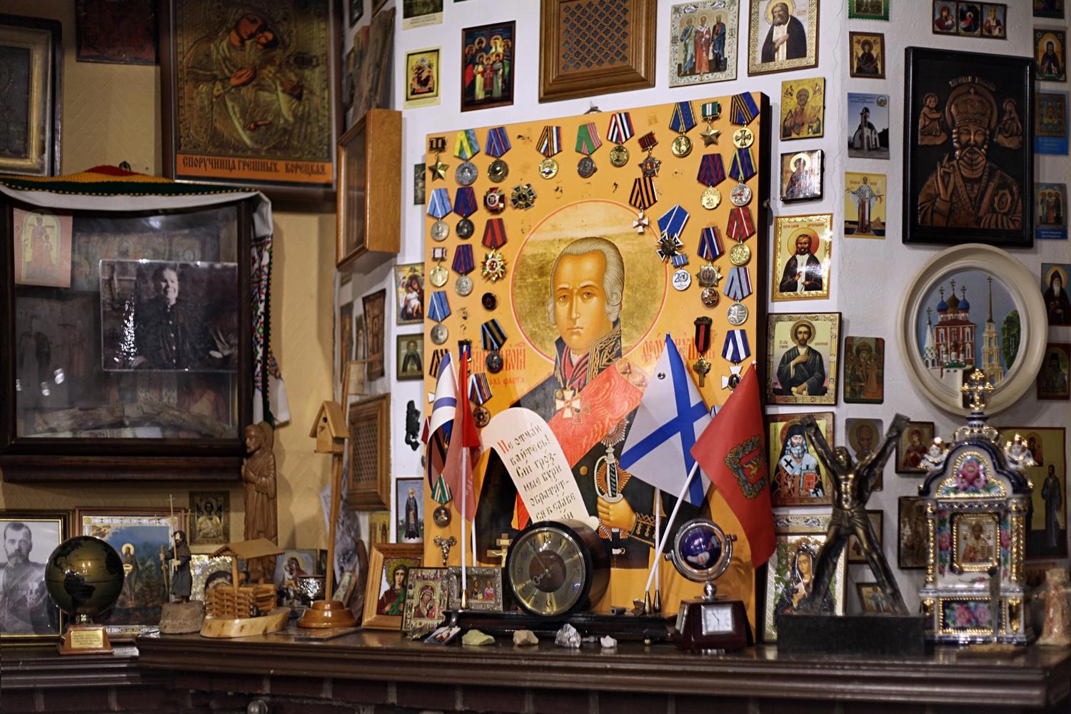 Памятных плит на стенах мастерской Конюхова множество. От покорителей космоса до Евгения Родионова, пережившего три месяца истезаний в чеченском плену и казненного за отказ снять крест. В ангаре Фёдора — мозаика адмирала Федора Ушакова, единственного адмирала, не потерявшего в бою ни одного корабля и признанного православной церковью святым. Стены на кухне Конюхова украшают поздравительные грамоты от Владимира Владимировича Путина. В мастерской — портреты Николая II и Фиделя Кастро. У приборной панели воздушного шара прикреплена подсказка: «0 — зиро, 1 — ван, 2 — ту, 3 — сри, 4 — фо, 5 — файф, 6 — сикс, 7 — сэвэн, 8 — эйт, 9 — найн, 10 — тен».
