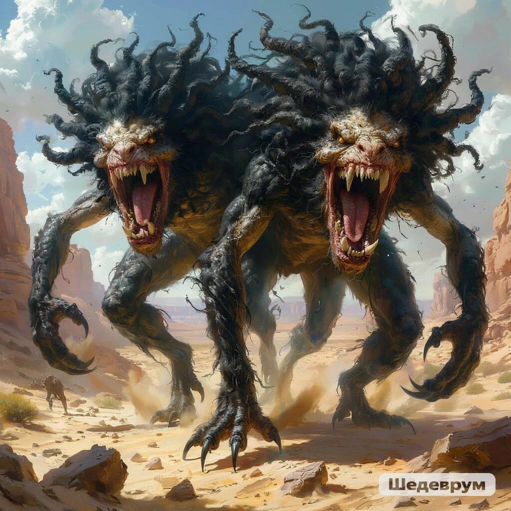Автор: МаксХарактерное блеяние раздалось совсем рядом, а спустя мгновение я увидел тех самых козлов. Это были жуткие двухголовые существа, мало чем напоминавшие козлов в обычном земном представлении. Огромные, с чёрной кучерявой шерстью и шестью ногами, они неслись на нас, раскрыв огромные пасти с двумя рядами зубов. При этом какой-то орган их тела не переставал издавать пронзительное блеяние.