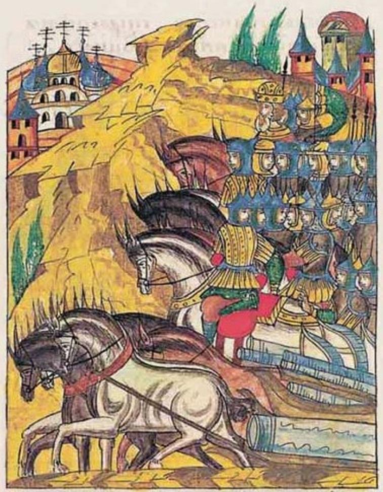 Эт а история случилась в 6936 году (1427/1428 г. по нашему летоисчислению). Самый верхний, в круглой шапке типа короны - литовский правитель Витовт. Он едет наказывать Господин Великий Новгород. Кроме бойцов, везет с собой еще разную артиллерию - "бяху же с ним и пушки и тюфяки и пищали"(на рисунке - палки в санях). Самое толстое бревно внизу - это и есть вундервафля великого Витовта: "едина же бе пушка с ним велика велми, Галка именем".