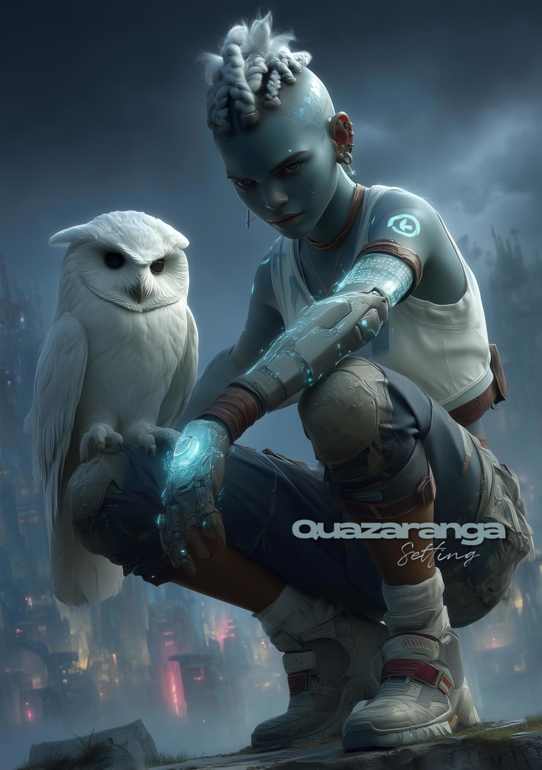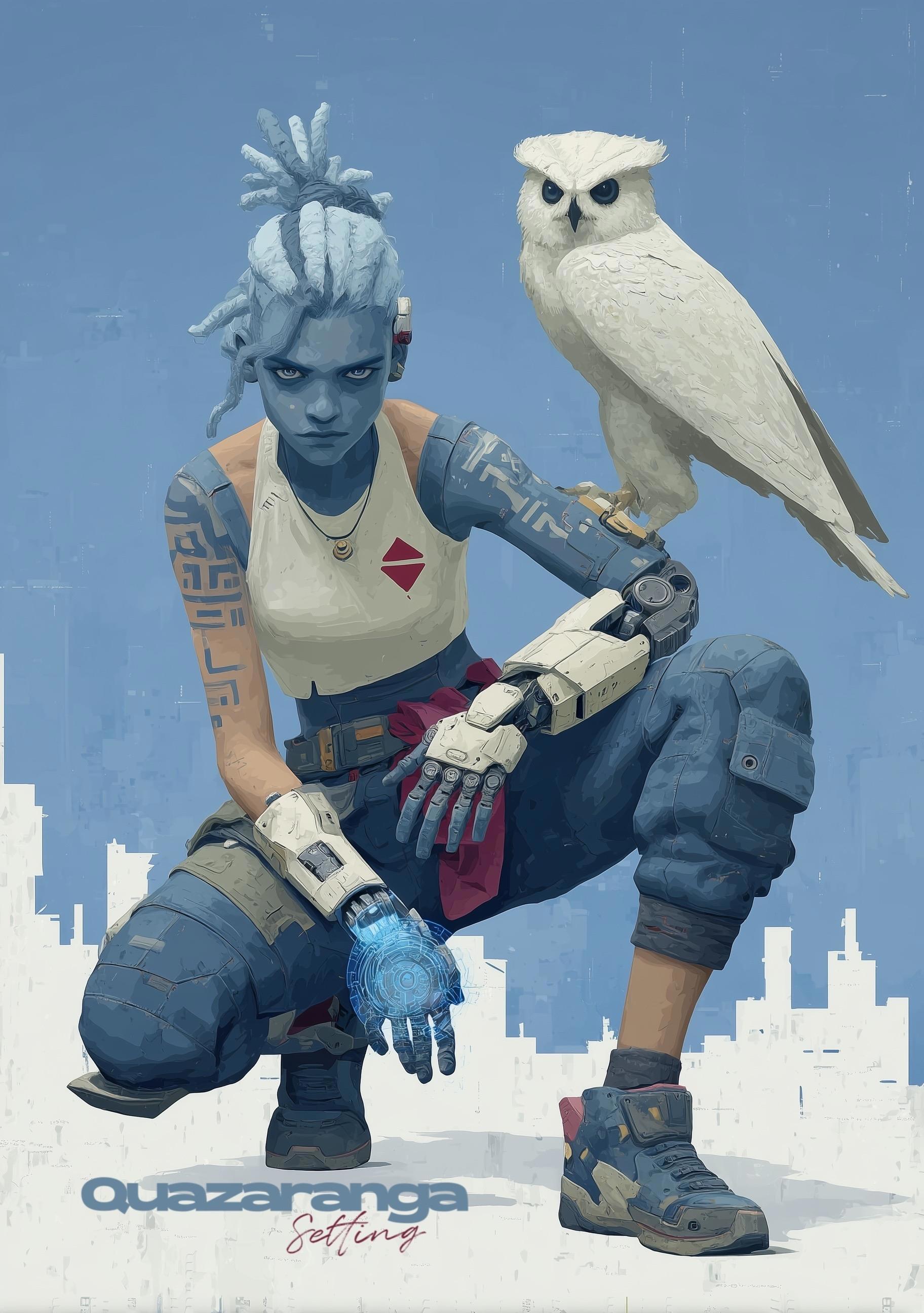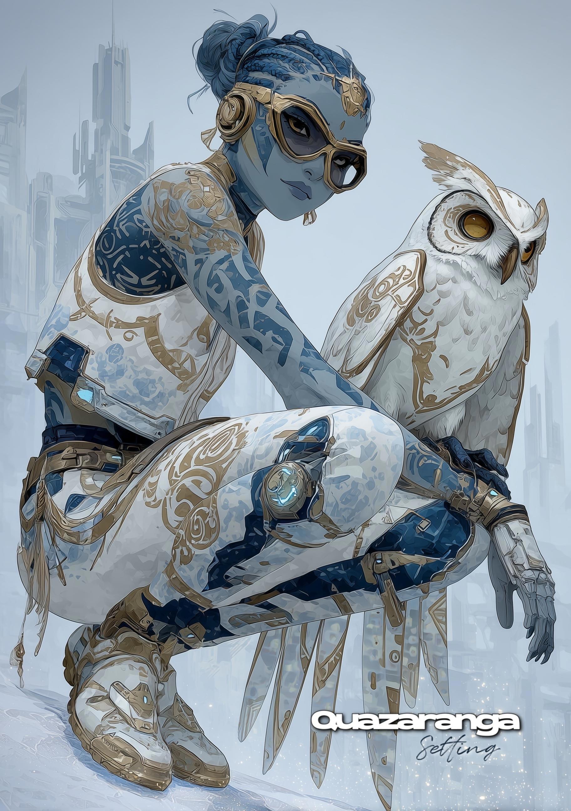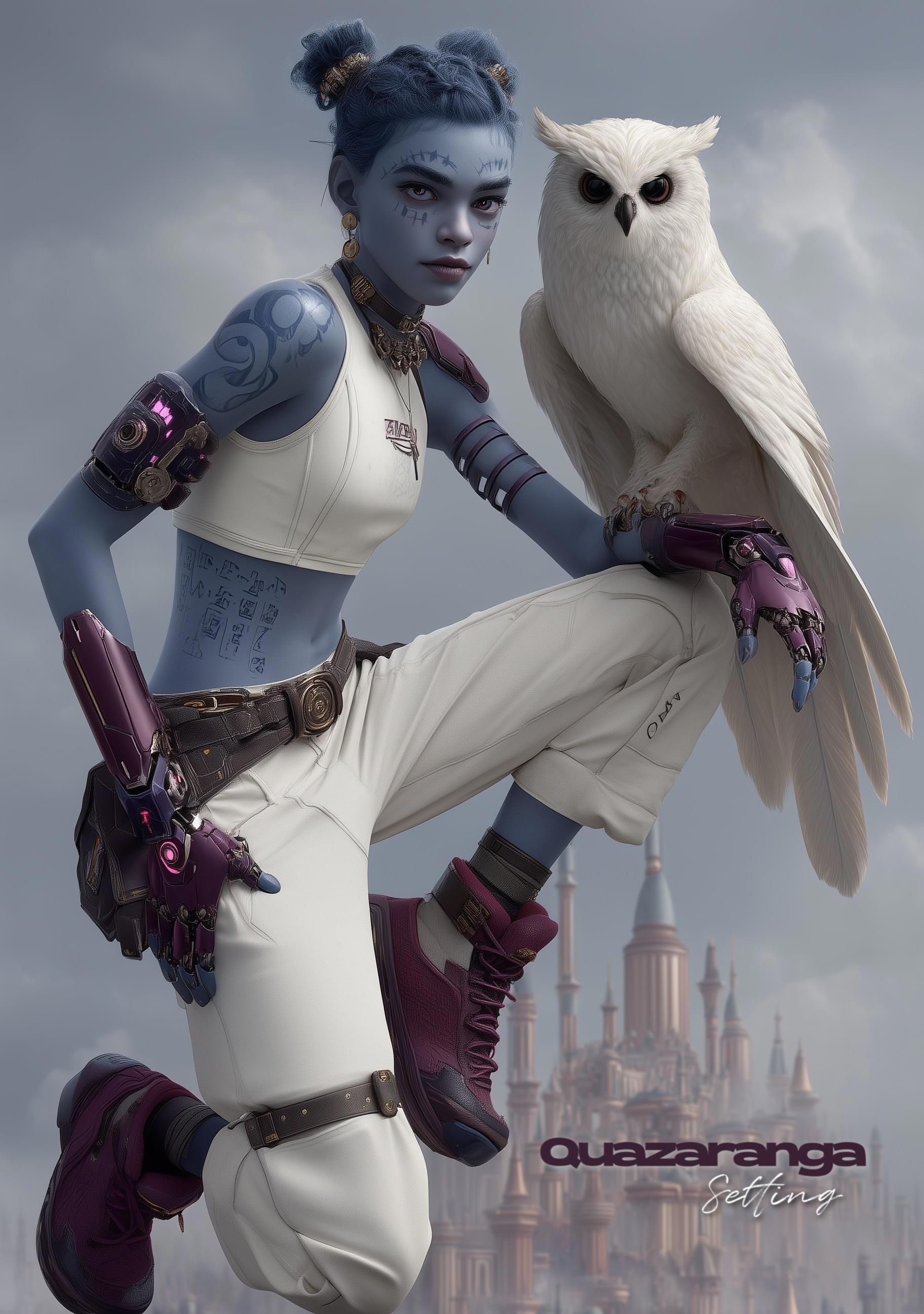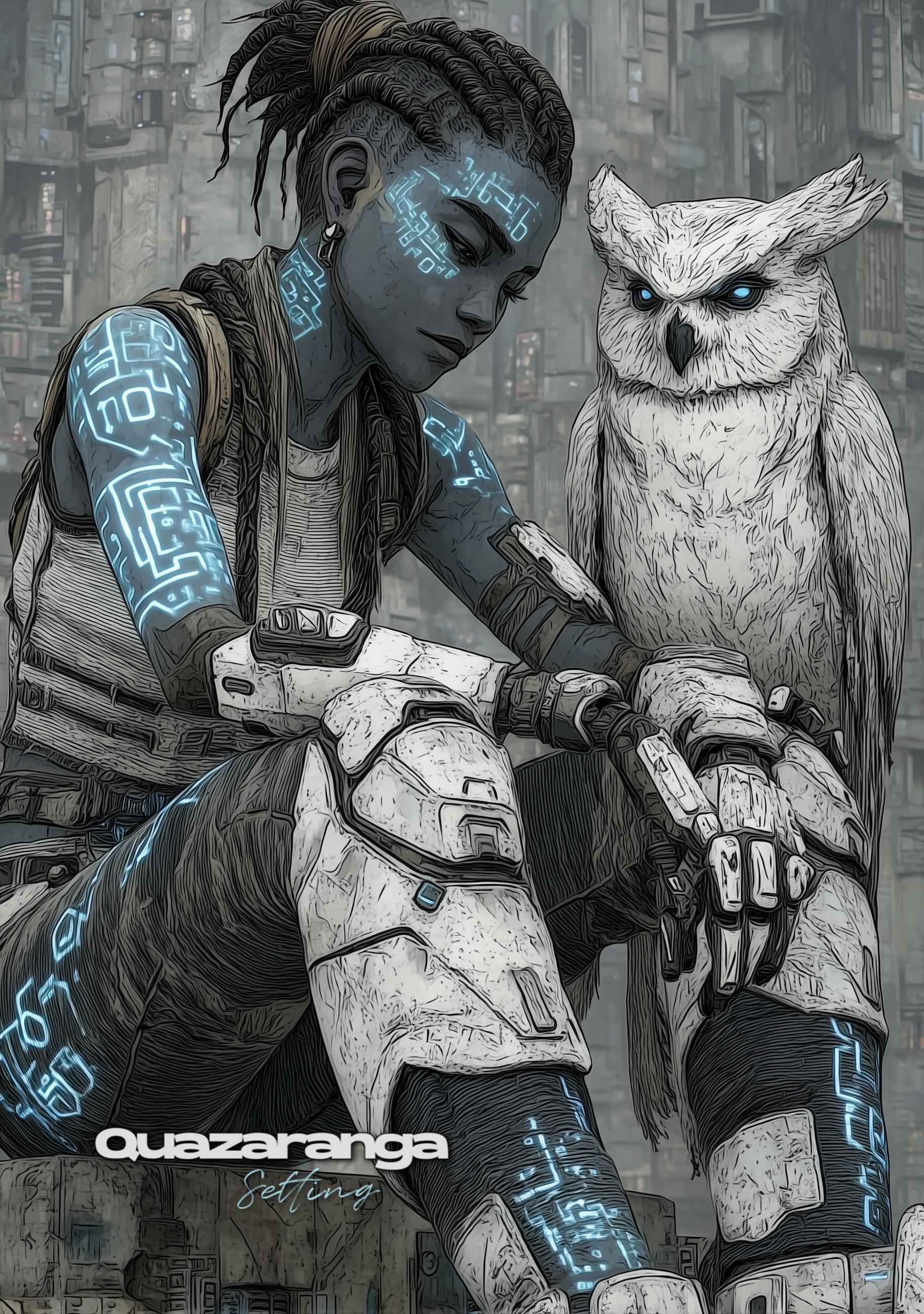 На картинке девочка нейрохакер с фамильяром совой. По логике, фамильяр — роботизированный, что не сильно заметно, но поправимо…