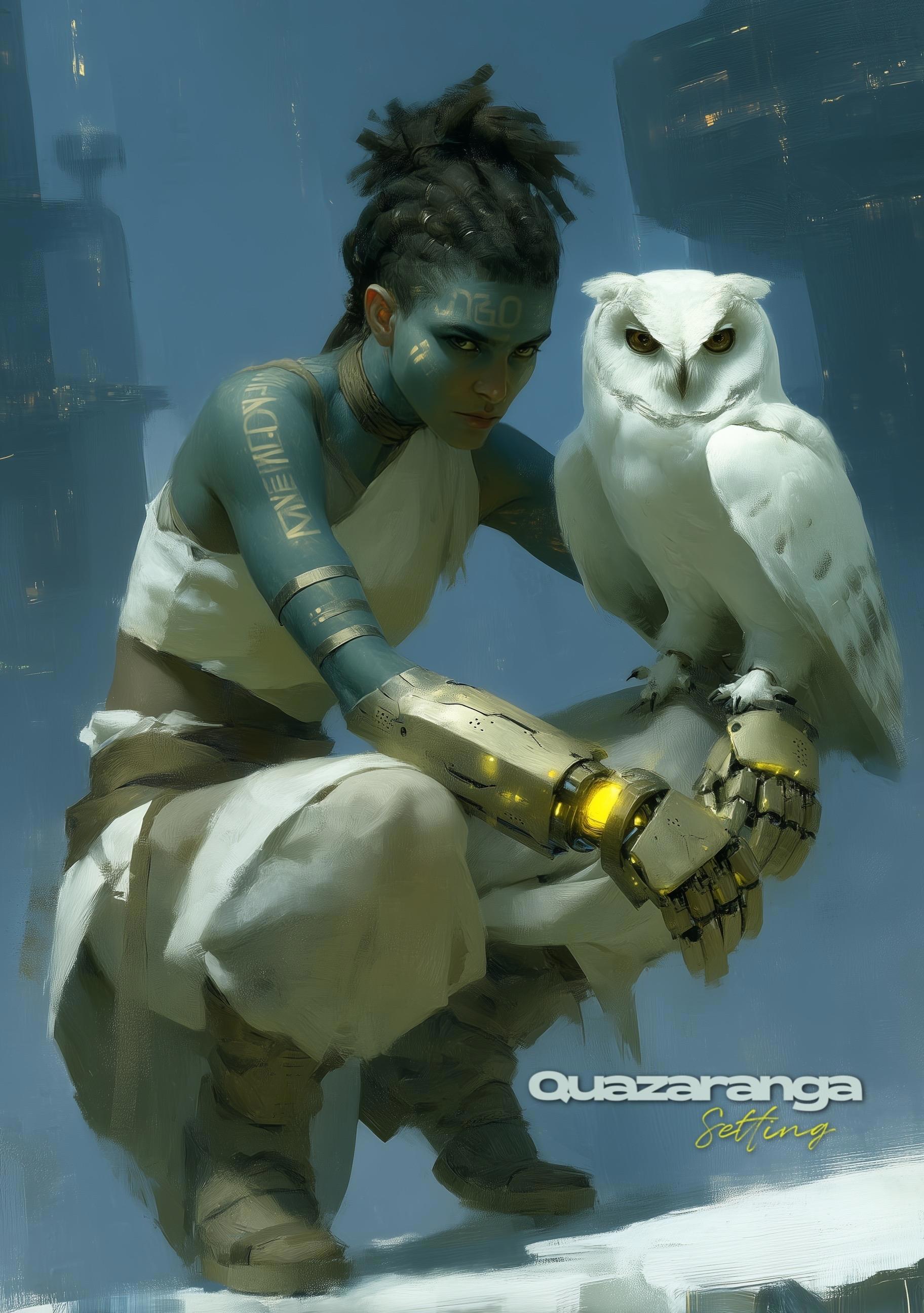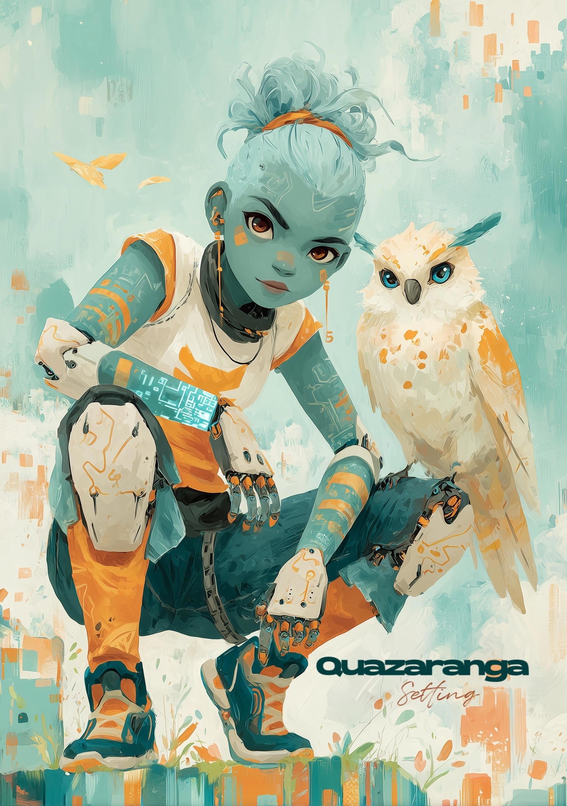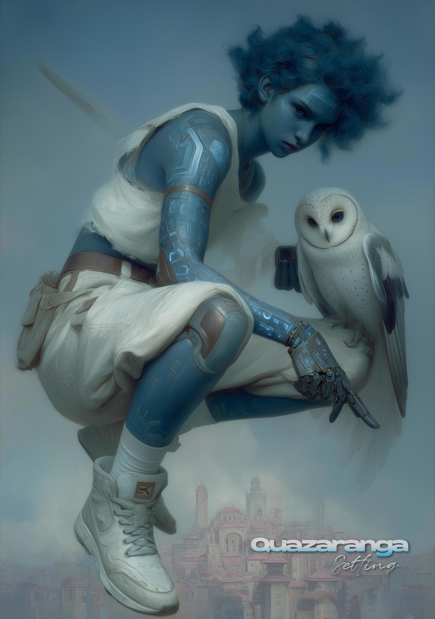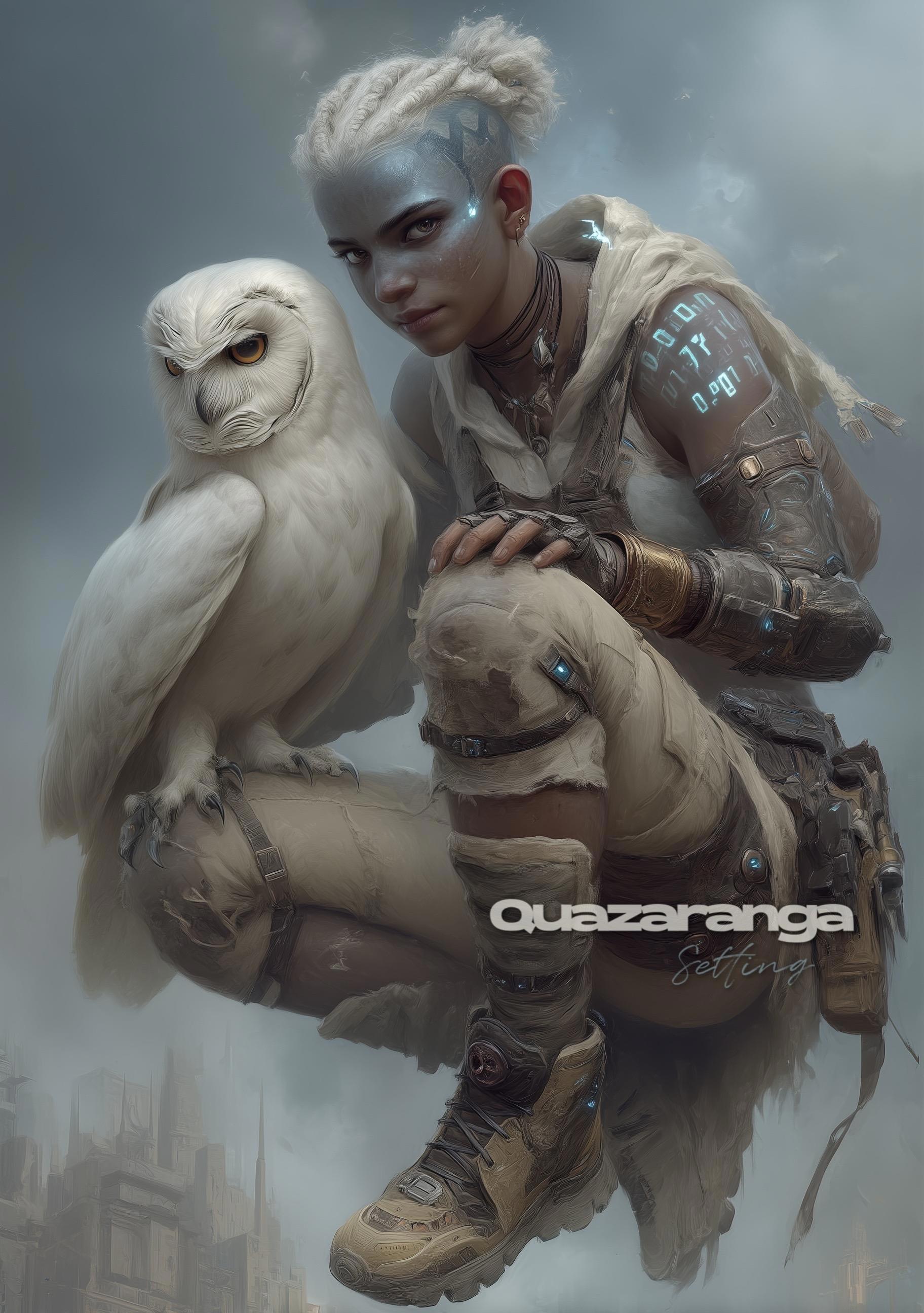 На картинке девочка нейрохакер с фамильяром совой. По логике, фамильяр — роботизированный, что не сильно заметно, но поправимо…