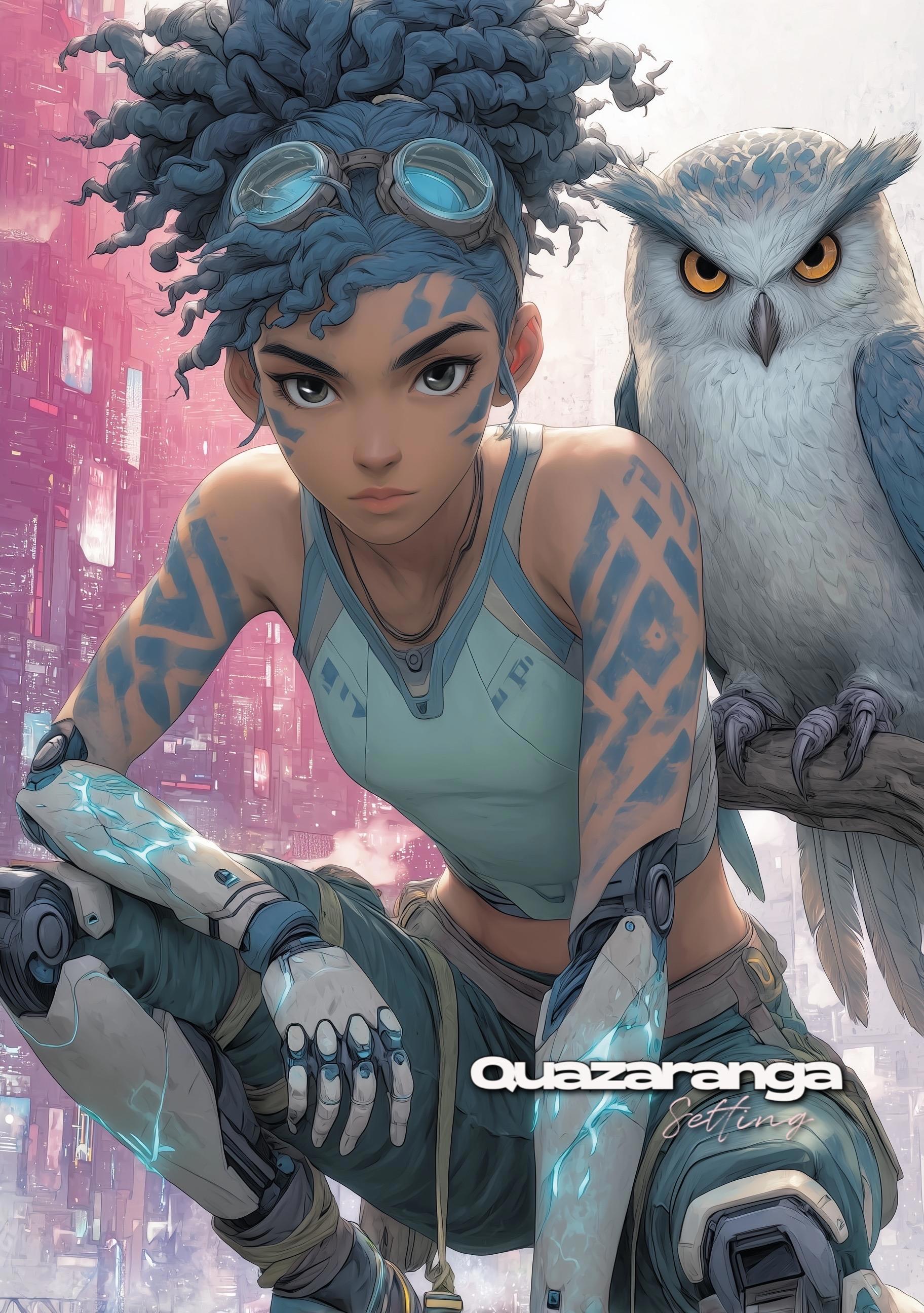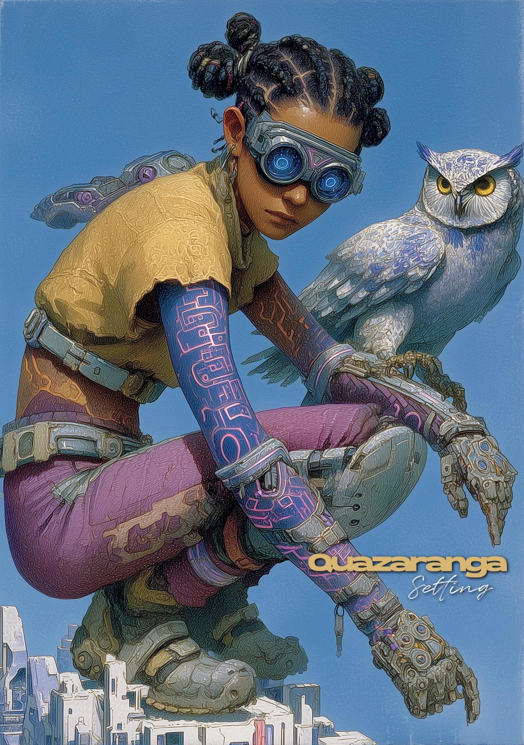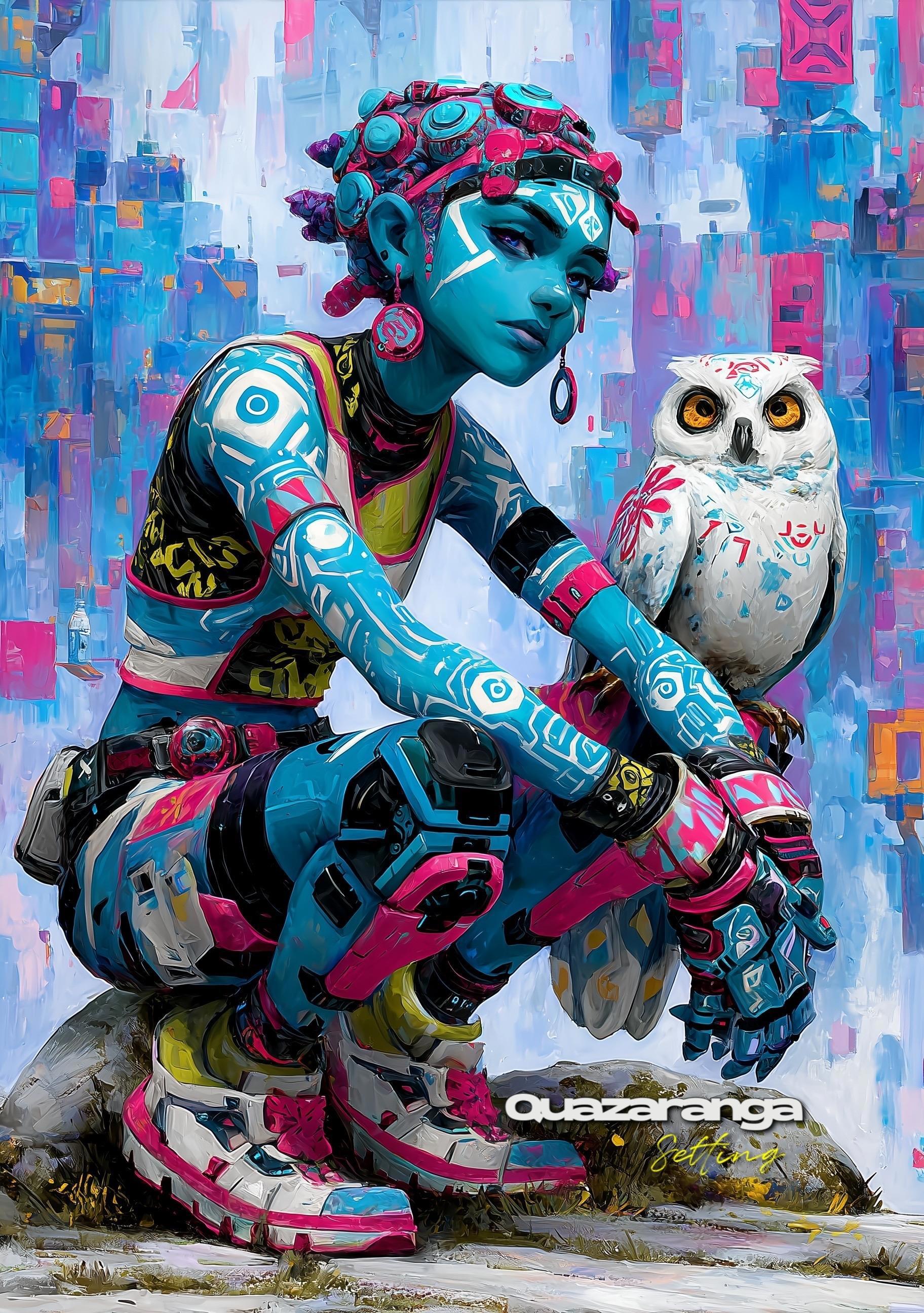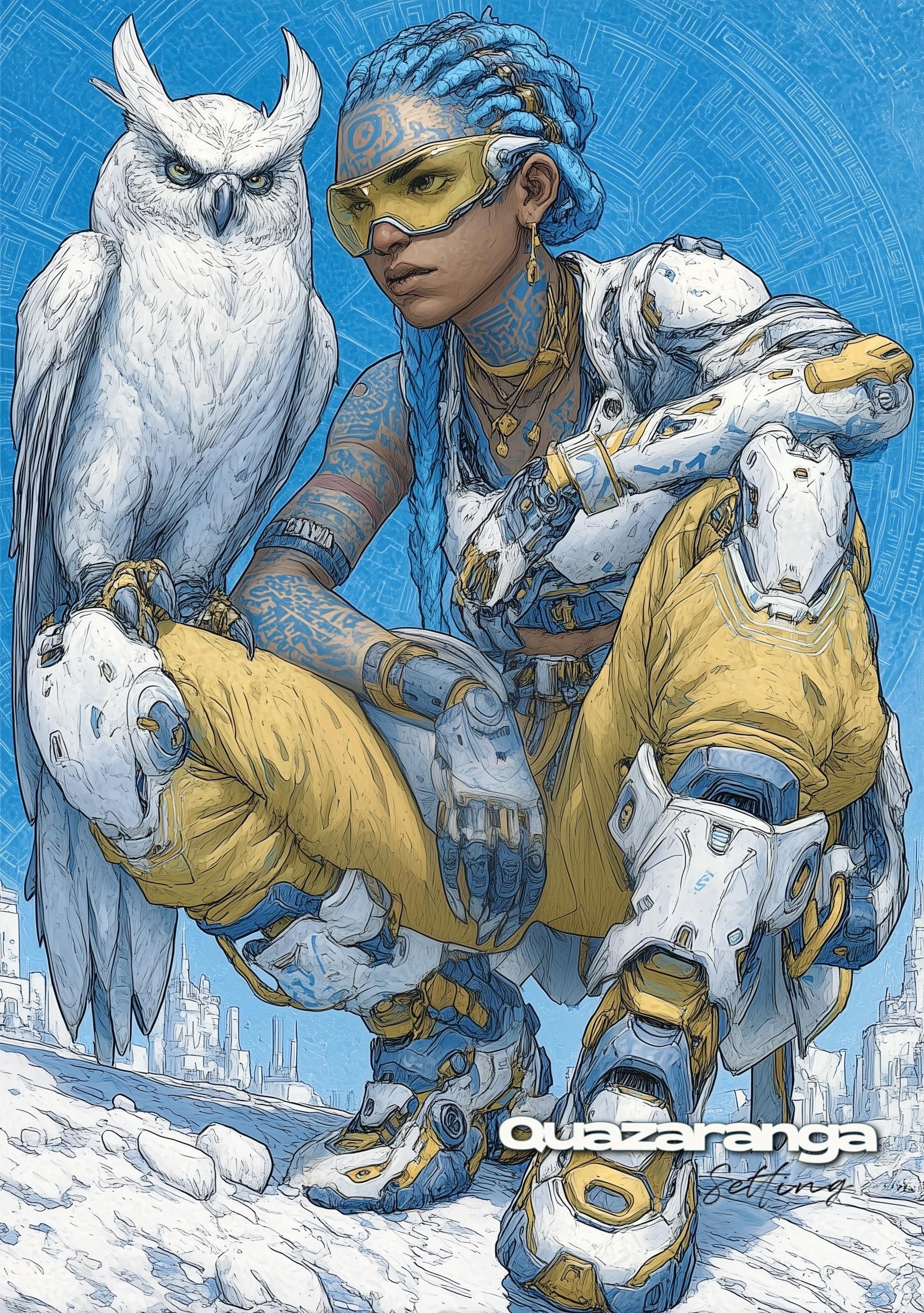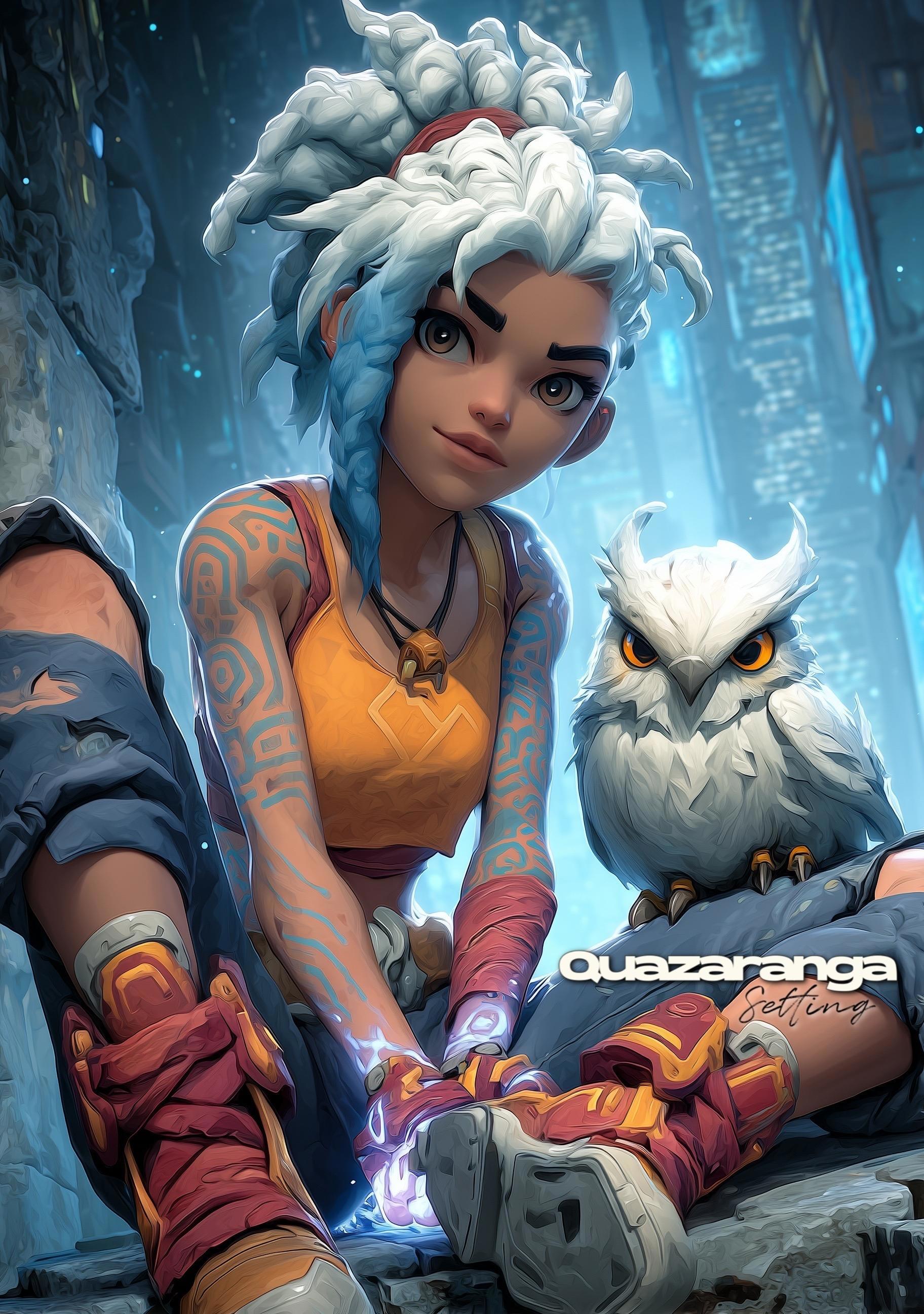 На картинке девочка нейрохакер с фамильяром совой. По логике, фамильяр — роботизированный, что не сильно заметно, но поправимо…