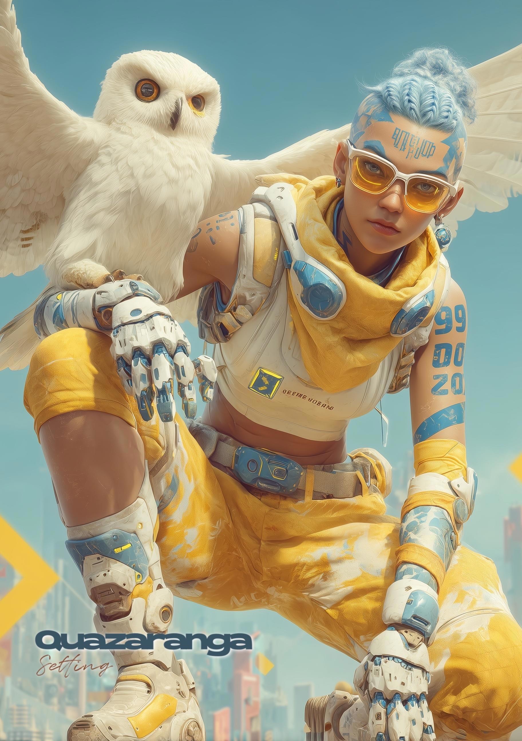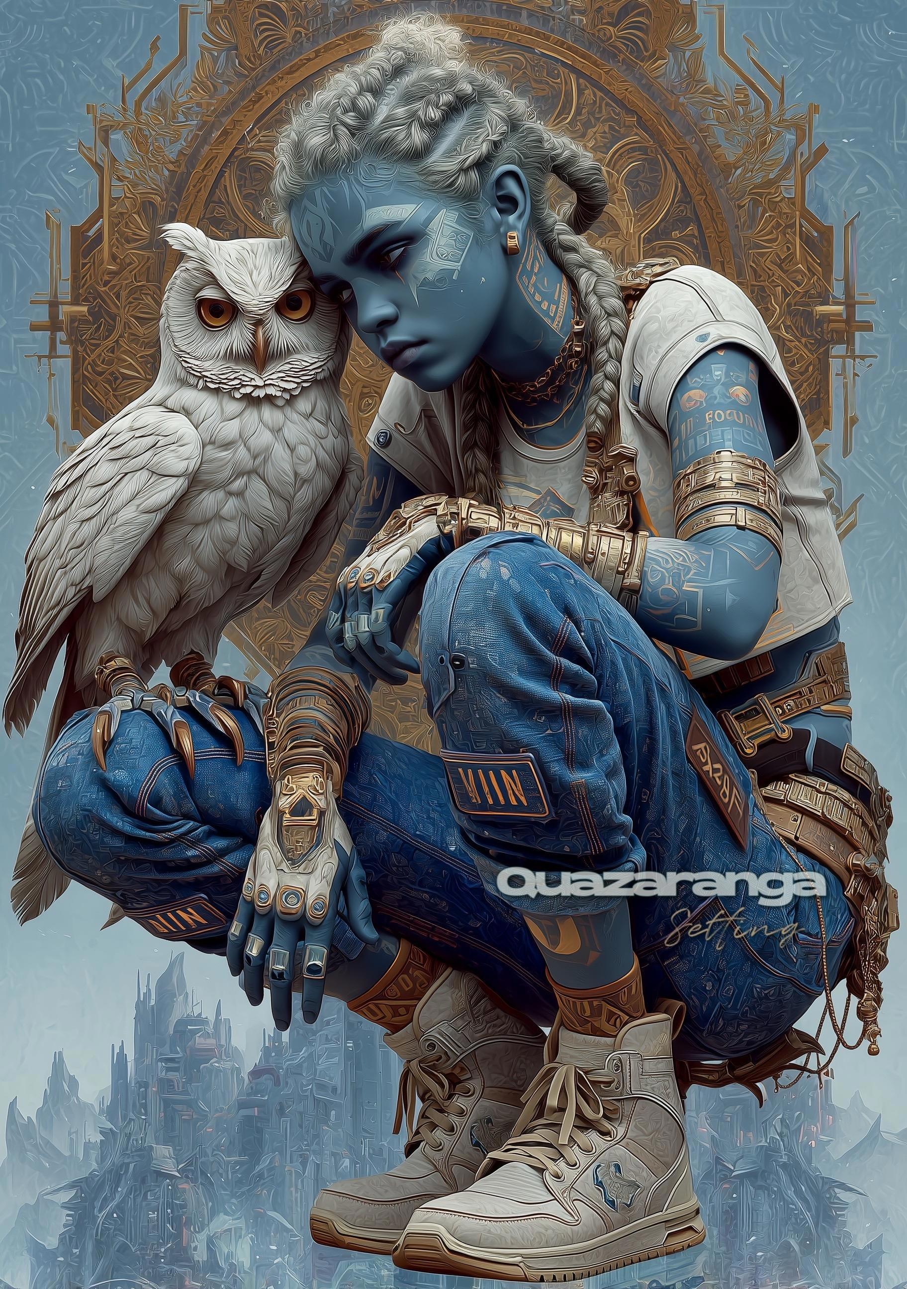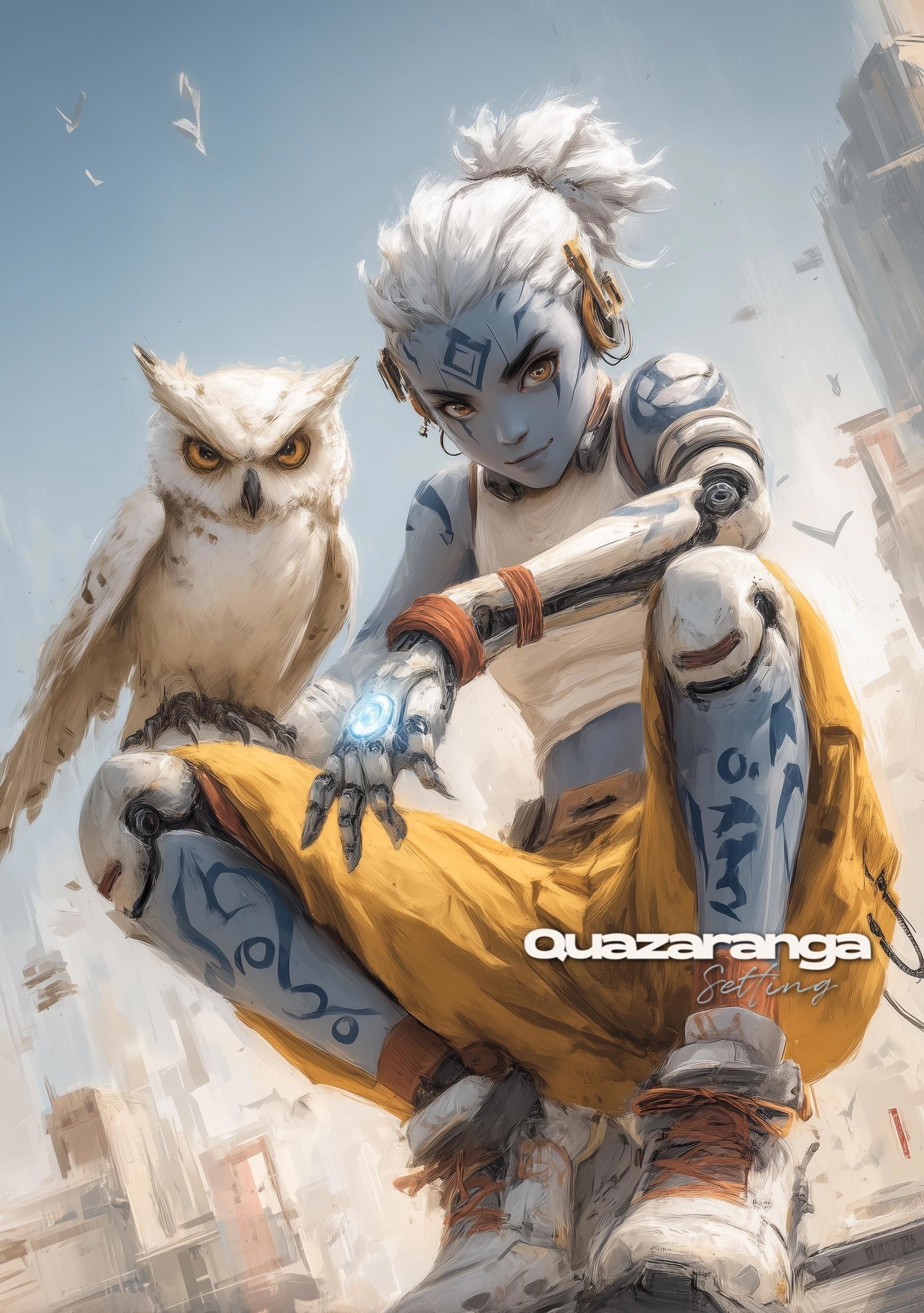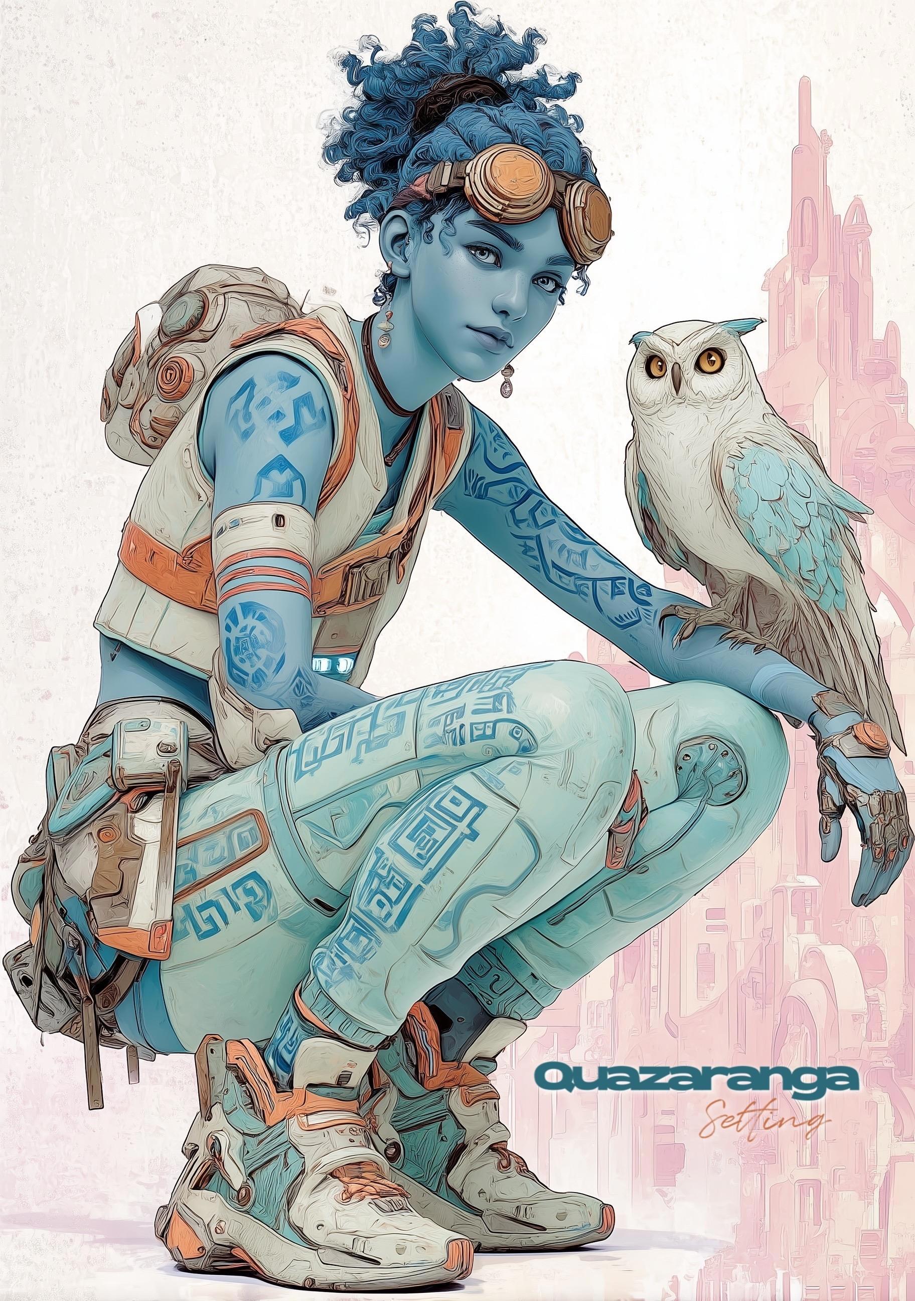 На картинке девочка нейрохакер с фамильяром совой. По логике, фамильяр — роботизированный, что не сильно заметно, но поправимо…