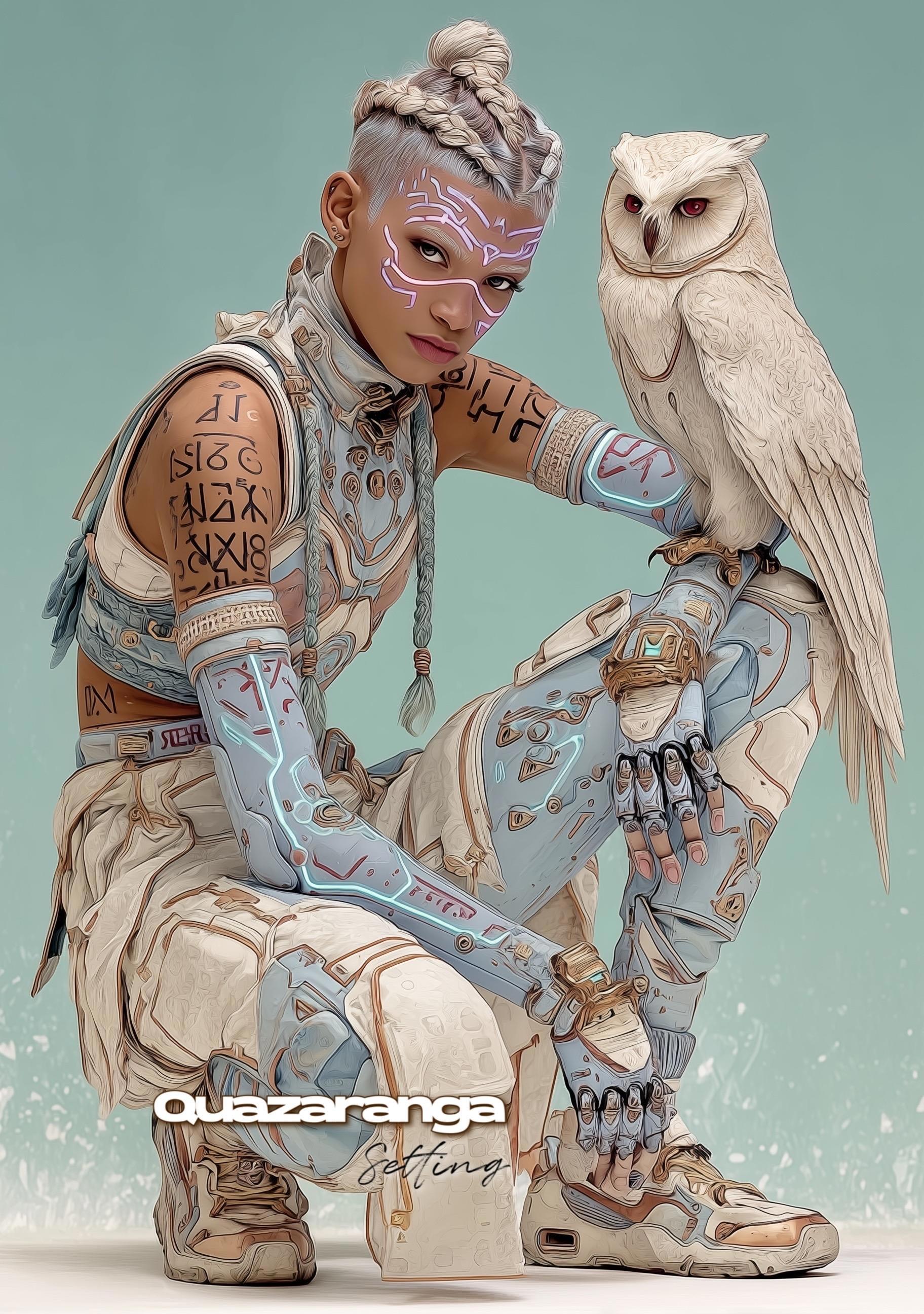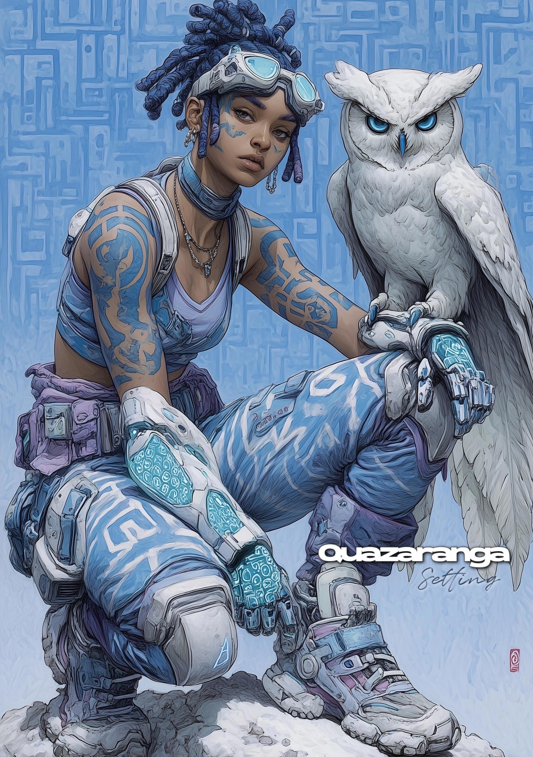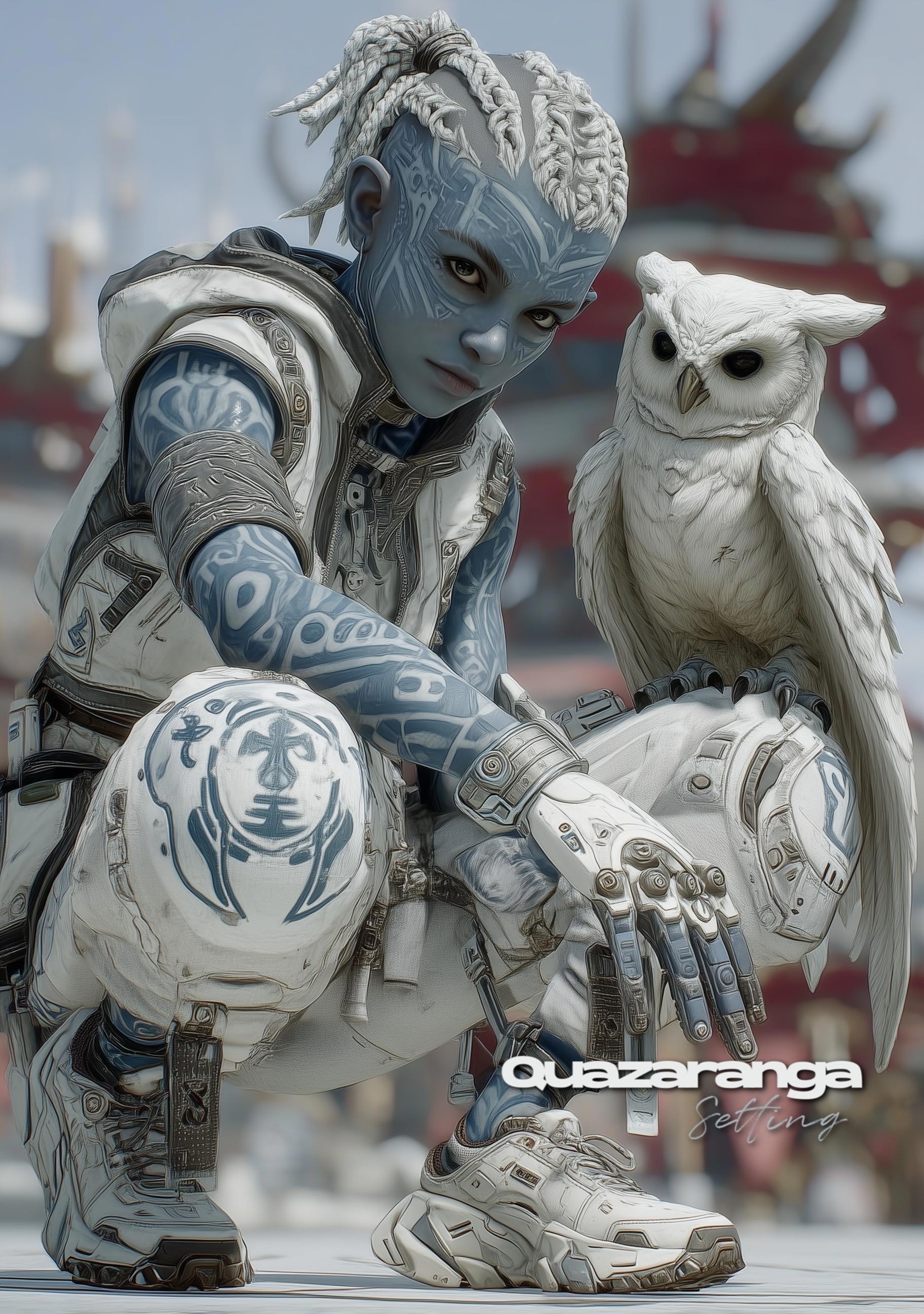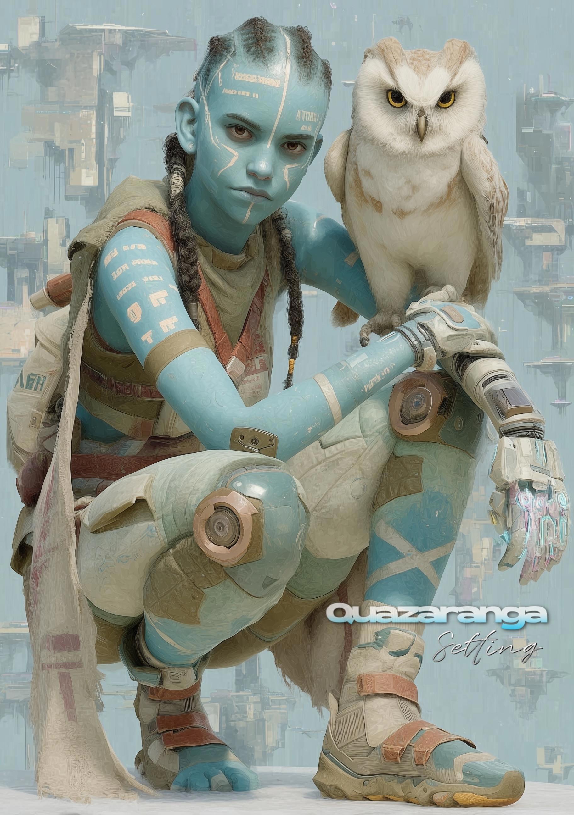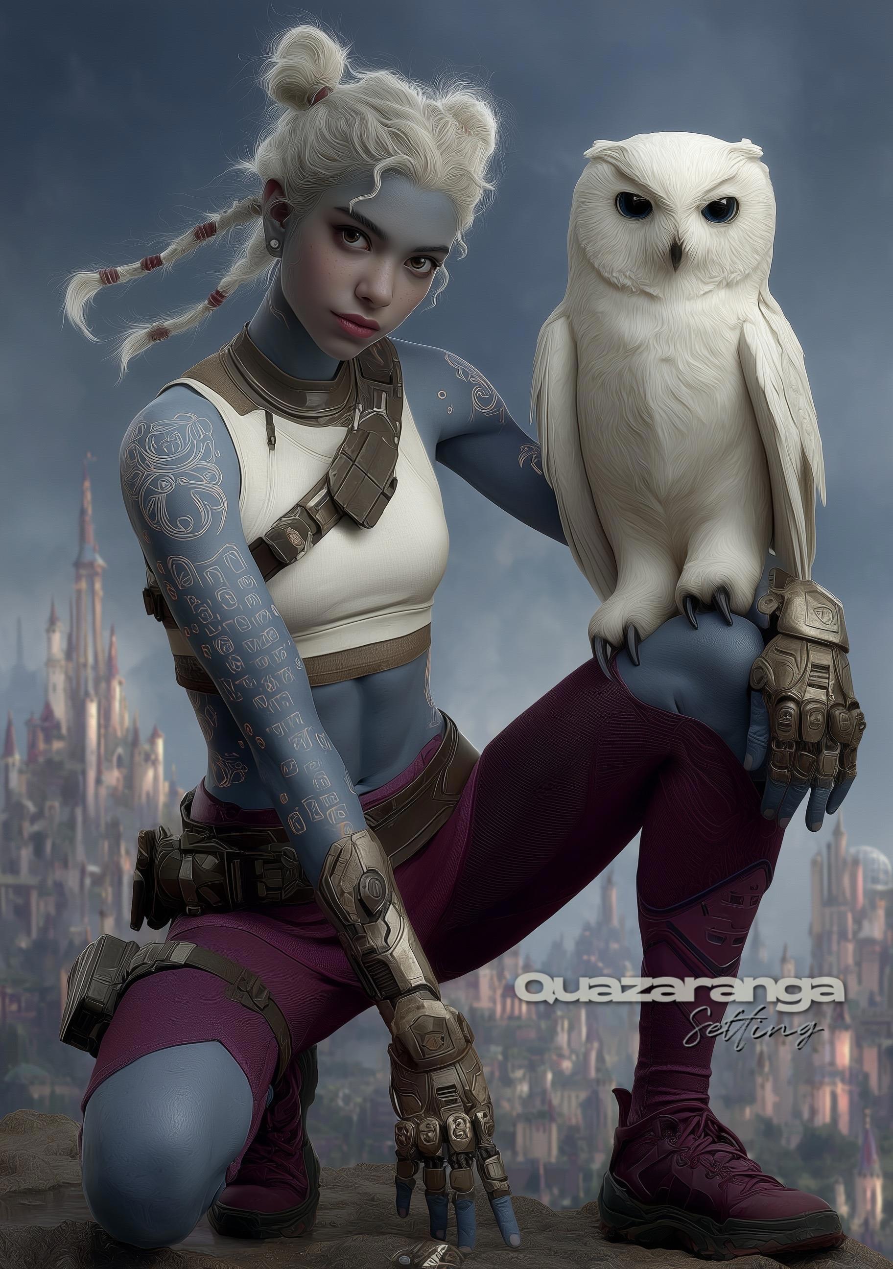 На картинке девочка нейрохакер с фамильяром совой. По логике, фамильяр — роботизированный, что не сильно заметно, но поправимо…